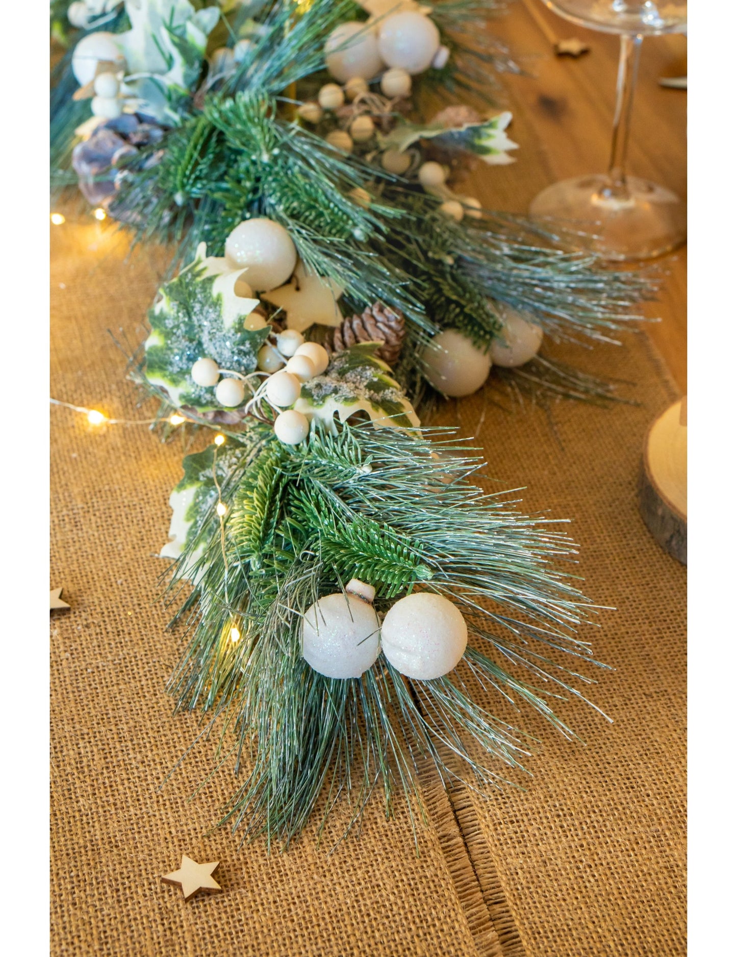 Тази гирлянда е с дължина приблизително 1 м. Той е съставен от елски клони, листа, борови шишарки, звезди и малки искрящи бели декорации. Тази гирлянда ще даде естествено докосване на вашата коледна украса!