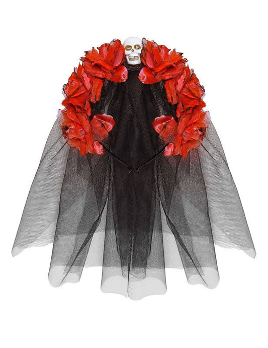 Червени цветя шапка с жена глава на смъртта Dia de los Muertos