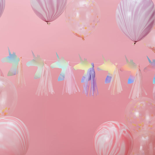 ПромоцияХартиена гирлянда с пискюли и еднорог в иридисцентни цветове 1,5 м