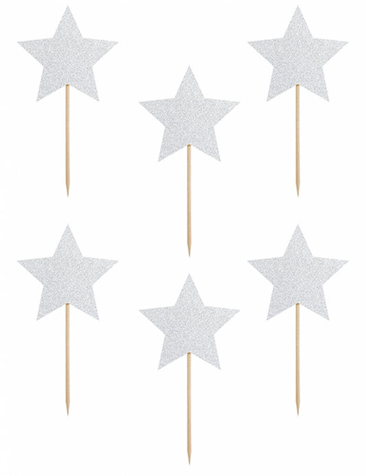 6 сребърни блестящи топери за торта със звезди на клечки 11.5 cm за рожден ден