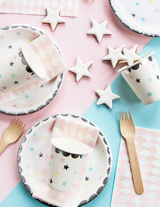 6 малки сребърни картонени чинийки във формата на звезда 18 cm парти