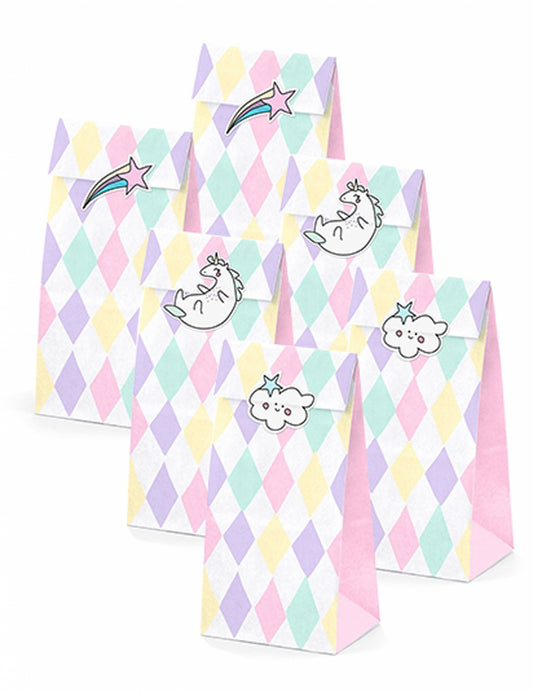 6 пастелни хартиени подаръчни торбички с еднорог, 8 x 18 x 6 cm