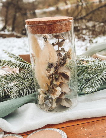 ПромоцияСтъклен буркан с пера и евкалипт 12.5 cm, коркова запушалка