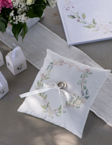 Възглавничка за венчална халка с ботанически мотив, 18 x 18 cm държач за пръстен