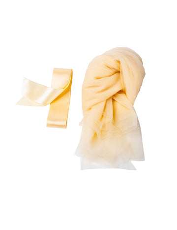 Включва: 1 табела "Да живеят младоженците" от тюл, 2 цветя от тюл , 1 ролка тюл , 2 възела за издърпване