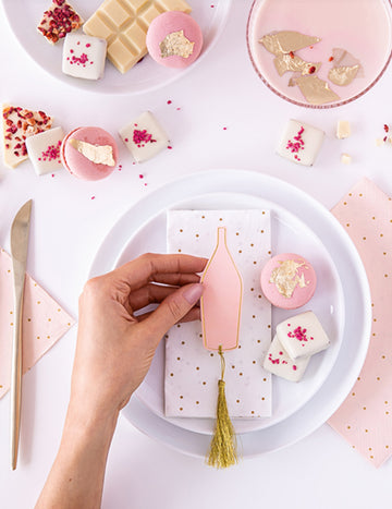 Изчерпано6 розови и златни картонени картички с форма на бутилка и златни пискюли