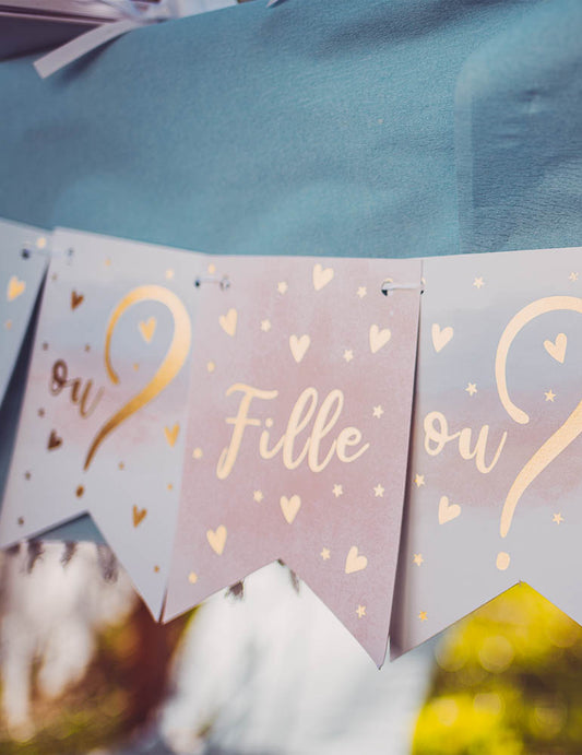 ИзчерпаноГирлянда с 11 розови, сини и златни вимпела за момиче или момче, 13 x 18 cm разкриване на пола