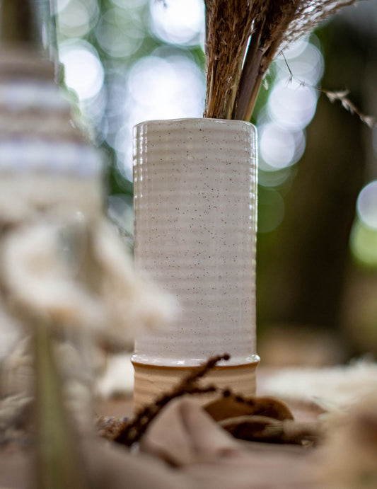 Аранжировка от сухи цветя и бели рози на стъбла в саксия 18 cm х 8 cm с ютен възел