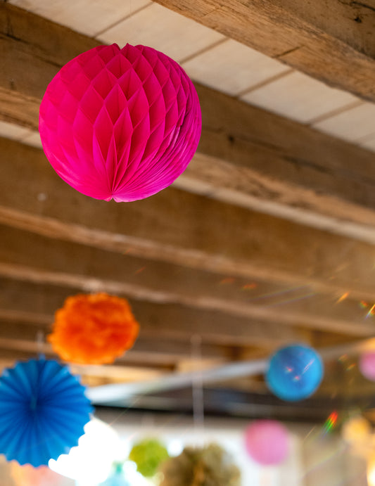 3 хартиени топки с форма на пчелна пита в цвят фуксия розово, размери 15, 20 и 25 cm да обеся