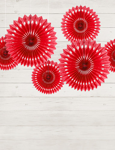 3 червени хартиени розетки с форма на ветрилообразен вентилатор, размери 20, 25 и 30 cm да обеся