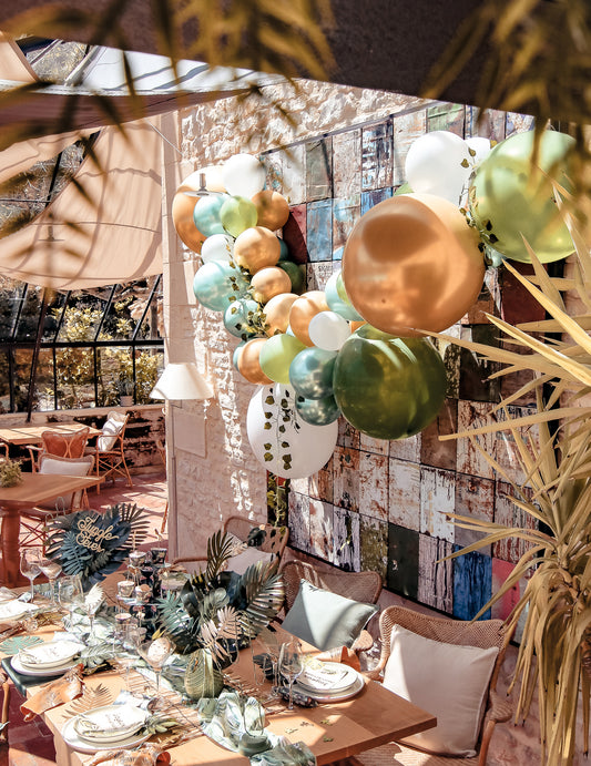 Включва: 4 45 см балони, 36 25 см балони, 30 12 см балони, 4 палмови листове, 6 билки от пампи, 1 пластмасова панделка, 1 ролка от шевове