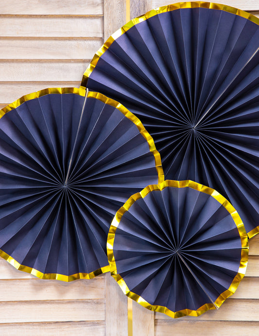 3 хартиени розетки в тъмносиньо и златно 23, 32 и 40 cm за окачване