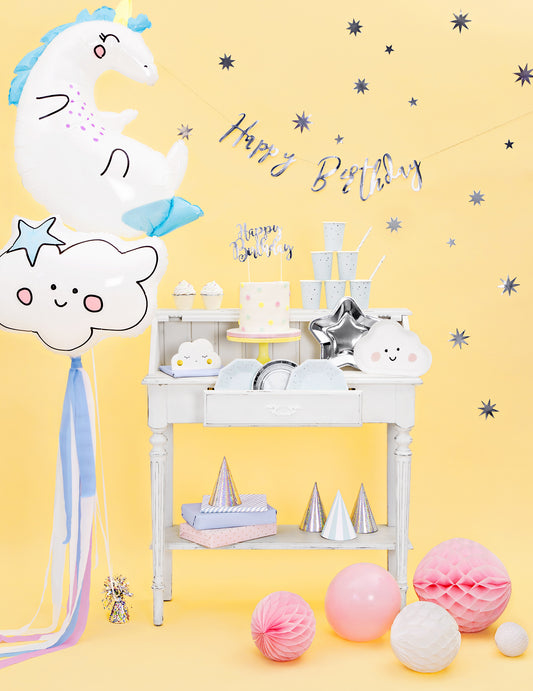 Guirlande en carton joyeux anniversaire argenté 1,80 m reflets métallisés