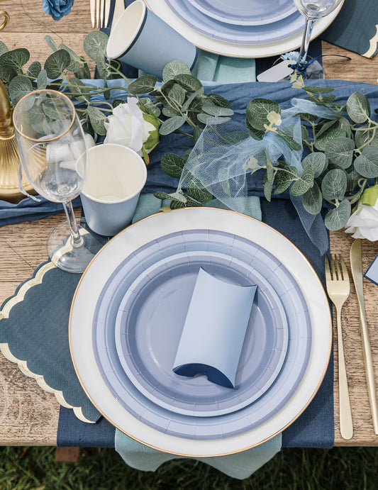 Изчерпано6 малки двуцветни картонени чинийки, тъмносиньо и буреносно синьо, 18 см, за партита
