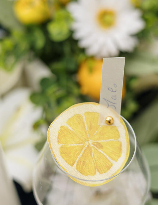 10 жълти хартиени картички за места, оформени като резенчета лимон