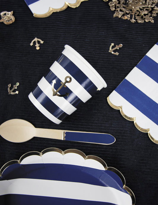 16 хартиени салфетки с фестончета в моряшки райета, 33 x 33 cm със златни ръбове