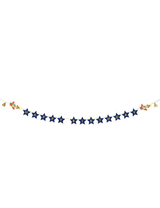 Гирлянда "Честит рожден ден", малък самолет, 2,5 м, син и златен