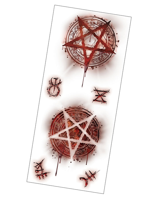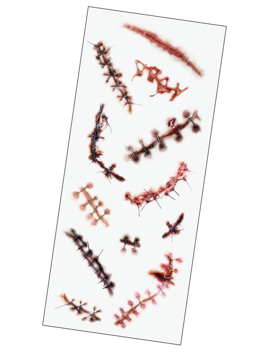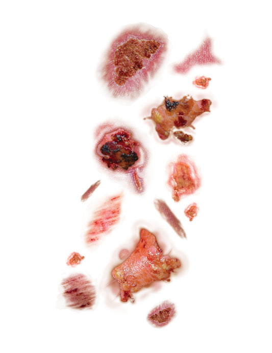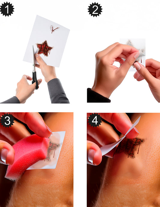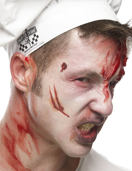 Включва: 3 Фалшиви кръвни капсули, 1 фалшива кръвна гел тръба, 3 сашета, 1 палитра 4 цвята, 1 молив, 1 четка, 2 гъби, 1 Забележка, Фалшива човешка плът, Палет 4 цвята, черен молив, Фалшива течна кръв, 2 гъби, 1 четка