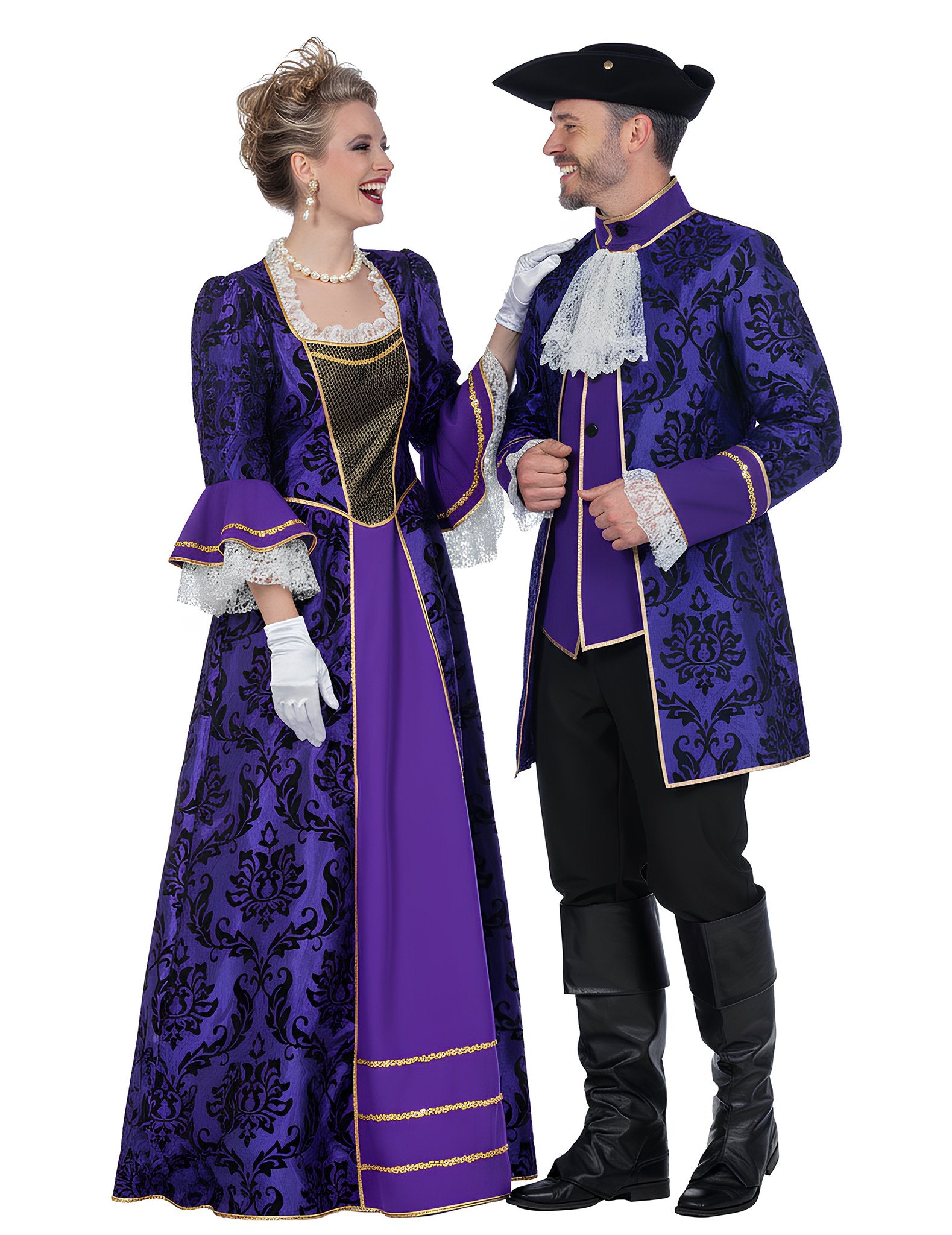 Мъжкият костюм се състои от дълго лилаво сако с черно-златни барокови мотиви, съчетано с елегантен панталон и пришита жилетка, за изтънчен и изискан вид. Маншетите и яката, украсени с бяла дантела, подчертават аристократичния стил, а вталената кройка елегантно ласкае фигурата. Дамският тоалет, от друга страна, включва пищна дълга лилава рокля, украсена със златна плитка и барокови мотиви, с разкроени ръкави и дантелени волани за визия, достойна за маркиза.