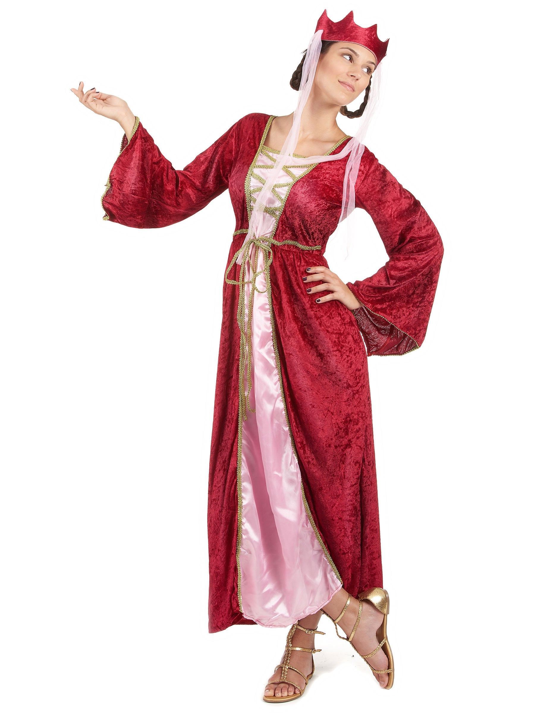 Средновековната маскировка на кралицата за жени, която се състои от дълъг червен имитация на кадифе и бледо розов сатен ефект, граничещ с златна граница и съвпадаща капачка. Размерът е еластичен за повече комфорт и ще отговаря на голям брой шаблони. Шепката предизвиква велурен ефект Fuschia Crown. Pink Tulle ленти добре аксесоари за лицето (обувките не са включени) Този костюм е идеален за вашите средновековни анимации, за карнавал или за всяко друго прикрито събитие.