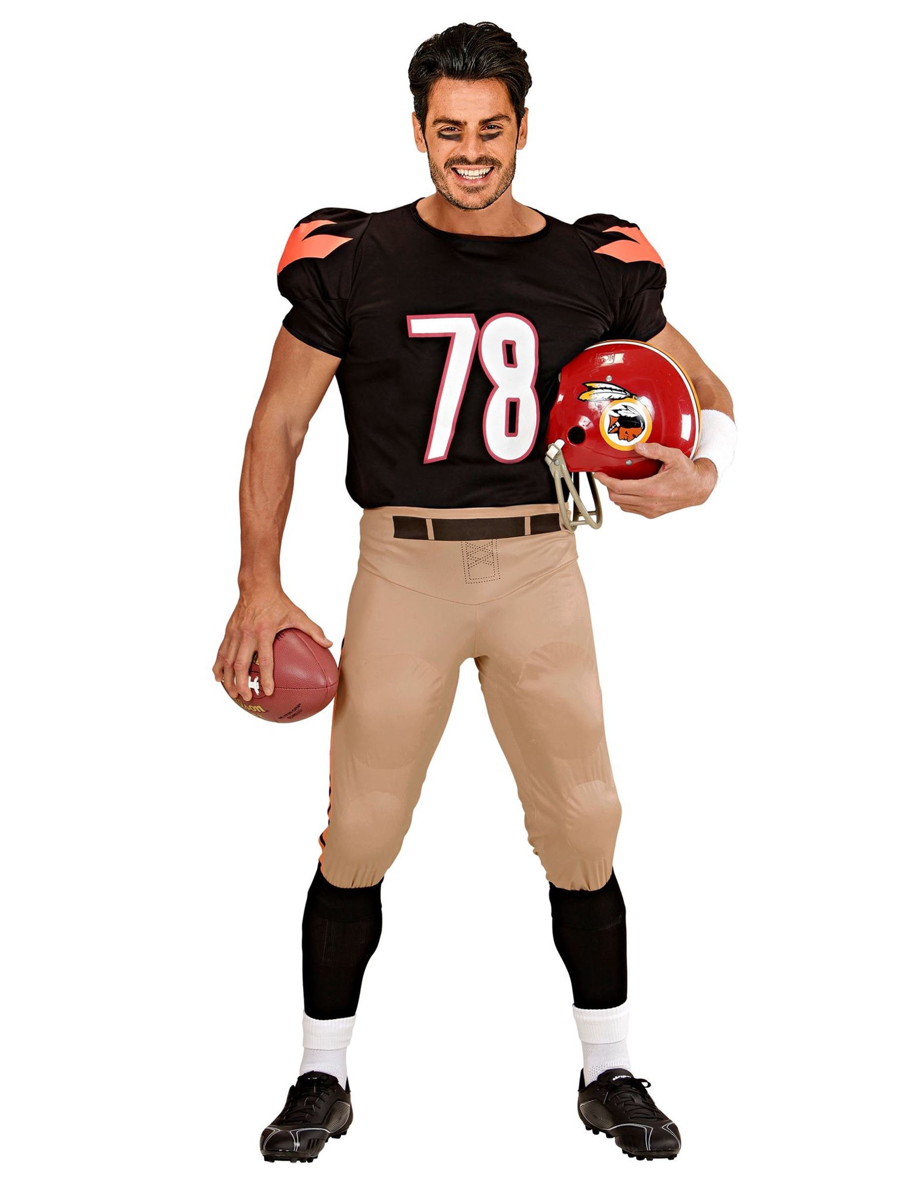 Този американски футболист костюм за мъже включва панталони с подплатени капри и подплатен връх. Това доста гъвкаво облекло ще отговаря на много размери. Този костюм е идеален за оригинален по време на тематичните ви партита костюми и впечатляването на приятелите ви. Copyright Widmann Srl