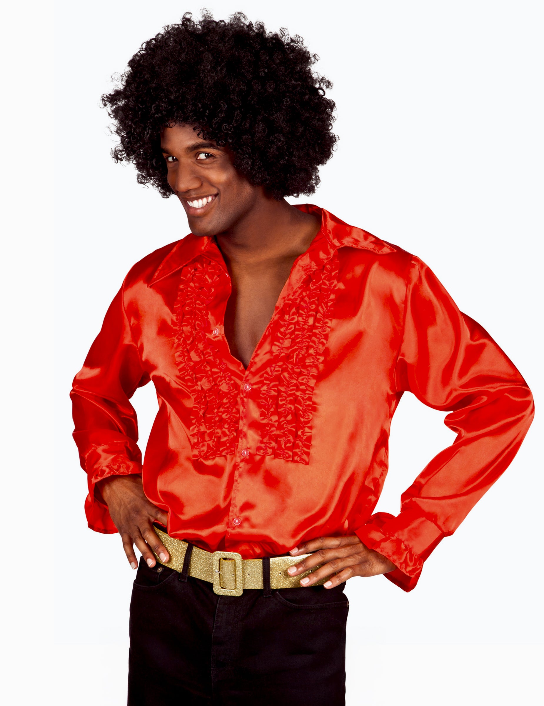 Тази диско прикритие за възрастни се състои от сатенено червена риза с разплаквани ръкави, копчета и излишъци. Този костюм ще бъде идеален за запалване на сцената по време на вашите диско -вечери!