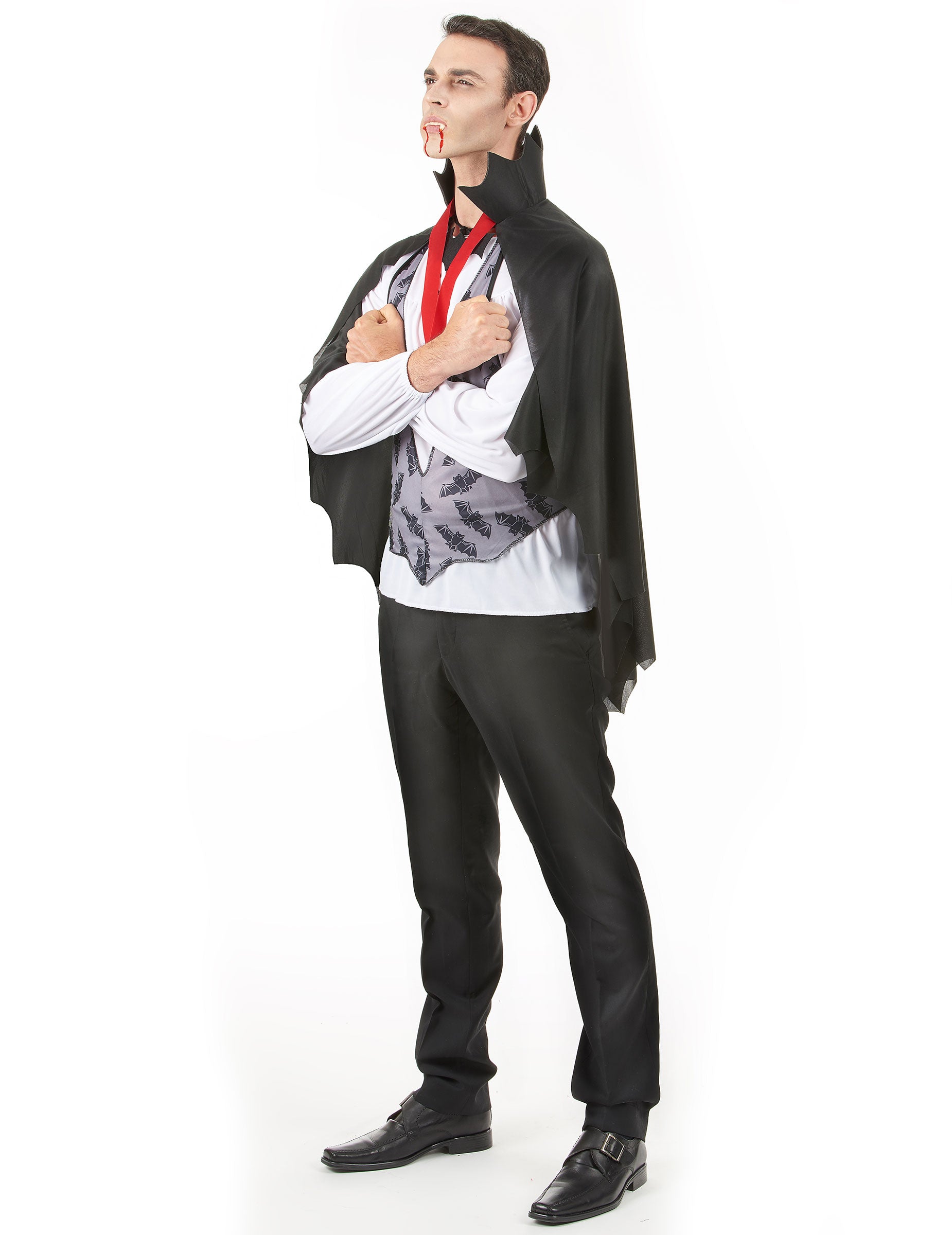 Тази маскировка за вампири за мъже на Хелоуин се състои от черен нос, фалшива жилетка, папийонка и висулка. Фалшивата жилетка е сива с модели на прилеп, тя е прикрепена към гърба и в шията. Златната висулка е фиксирана на червена панделка, а вратовръзката е във формата на бухалка (панталони, протези, обувки и бяла риза не са включени). Този костюм на Дракула е идеален за всички ваши тематични вечери, за шоу или за Хелоуин.