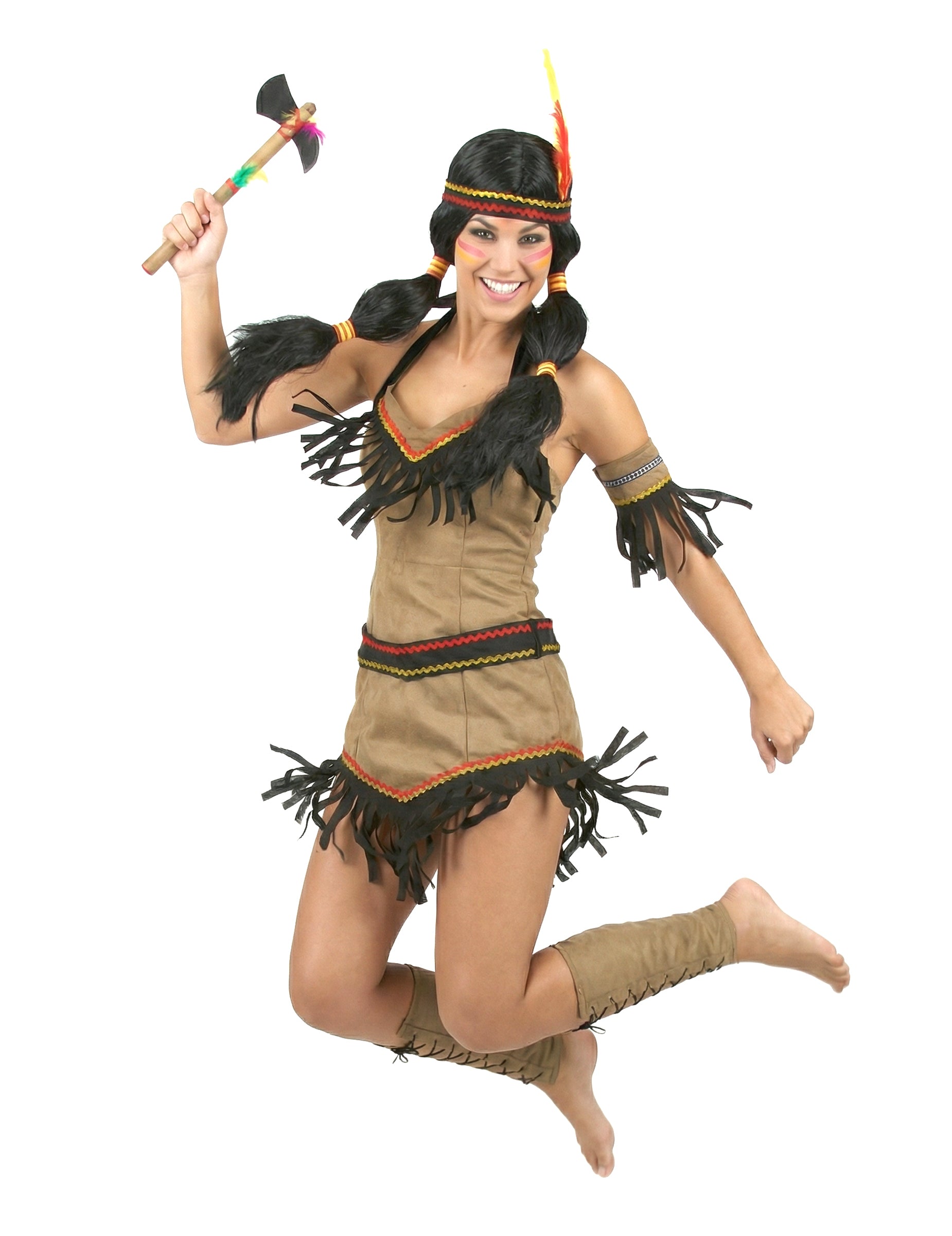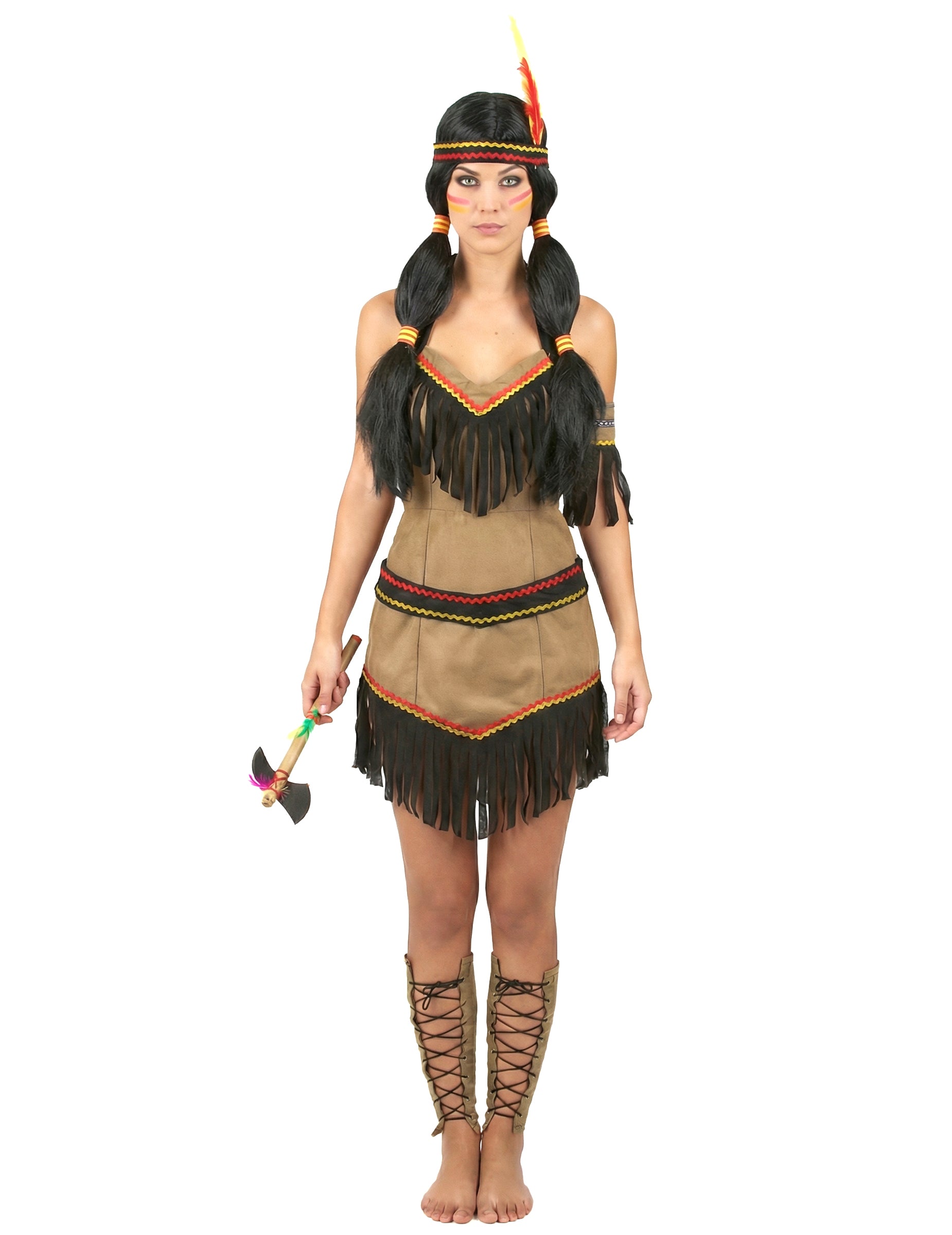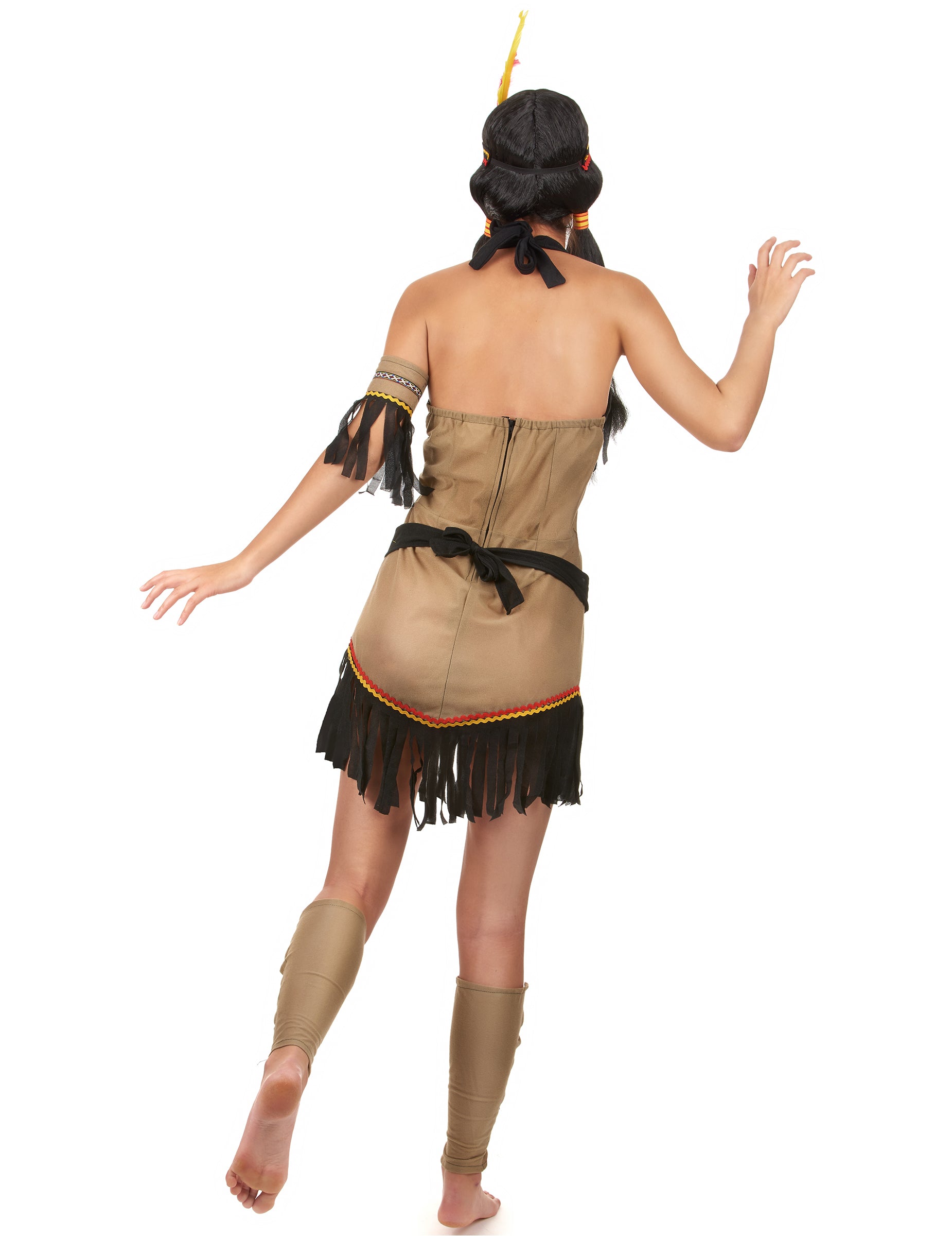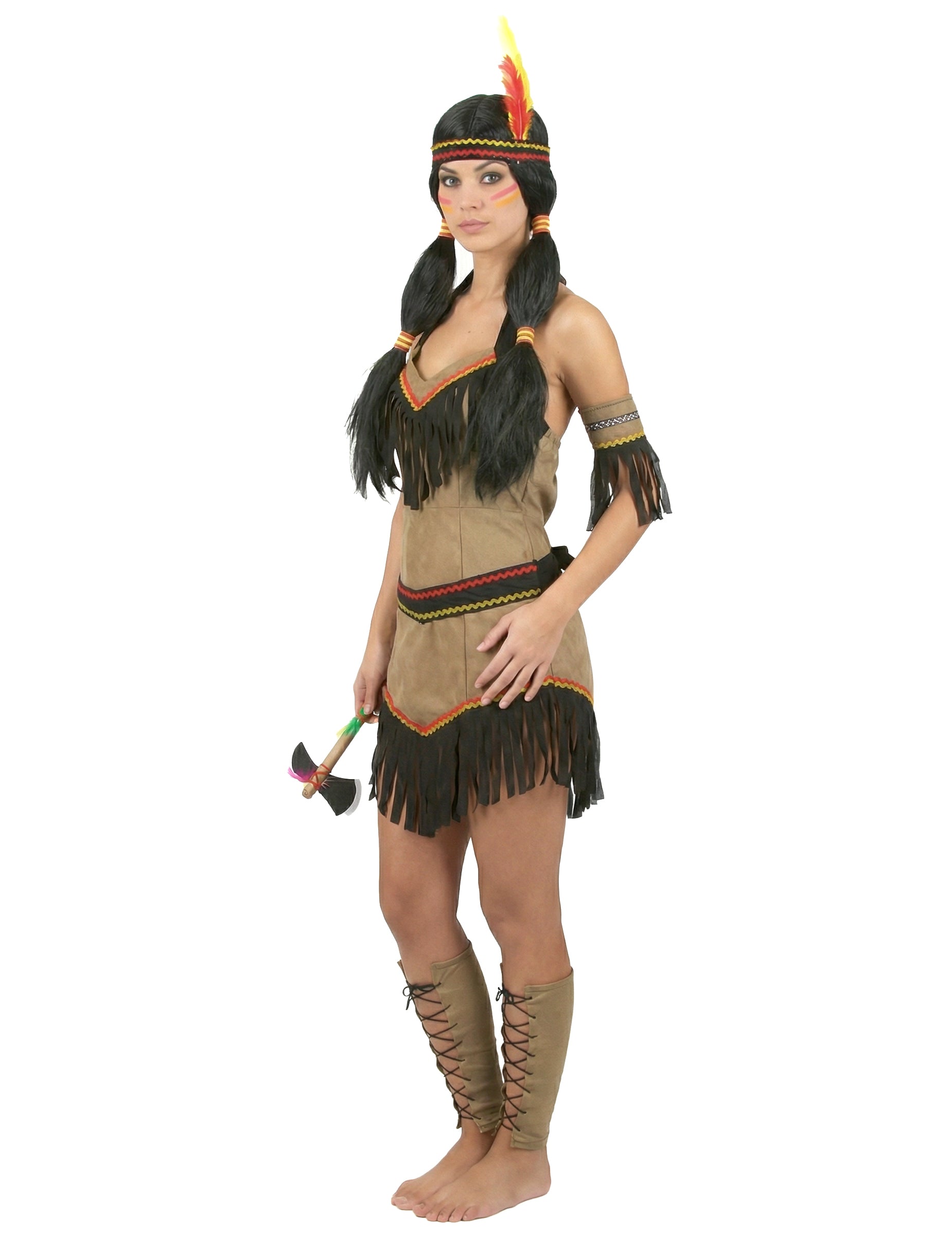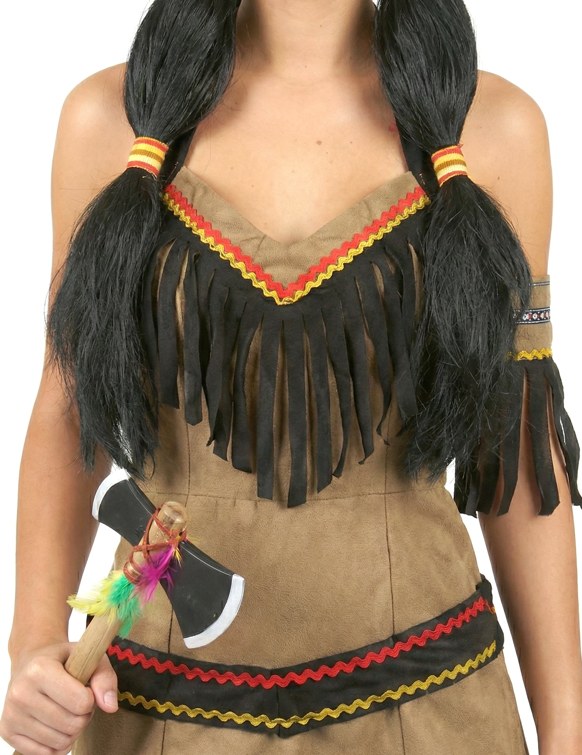 Роклята е изработена от кафяв плат, за да имитира типичните облекла от животинска кожа на коренните американциТази еластична рокля ще се адаптира перфектно към формата на тялото ви и е украсена с цветни кантове и ресни за 100% индийски стил.