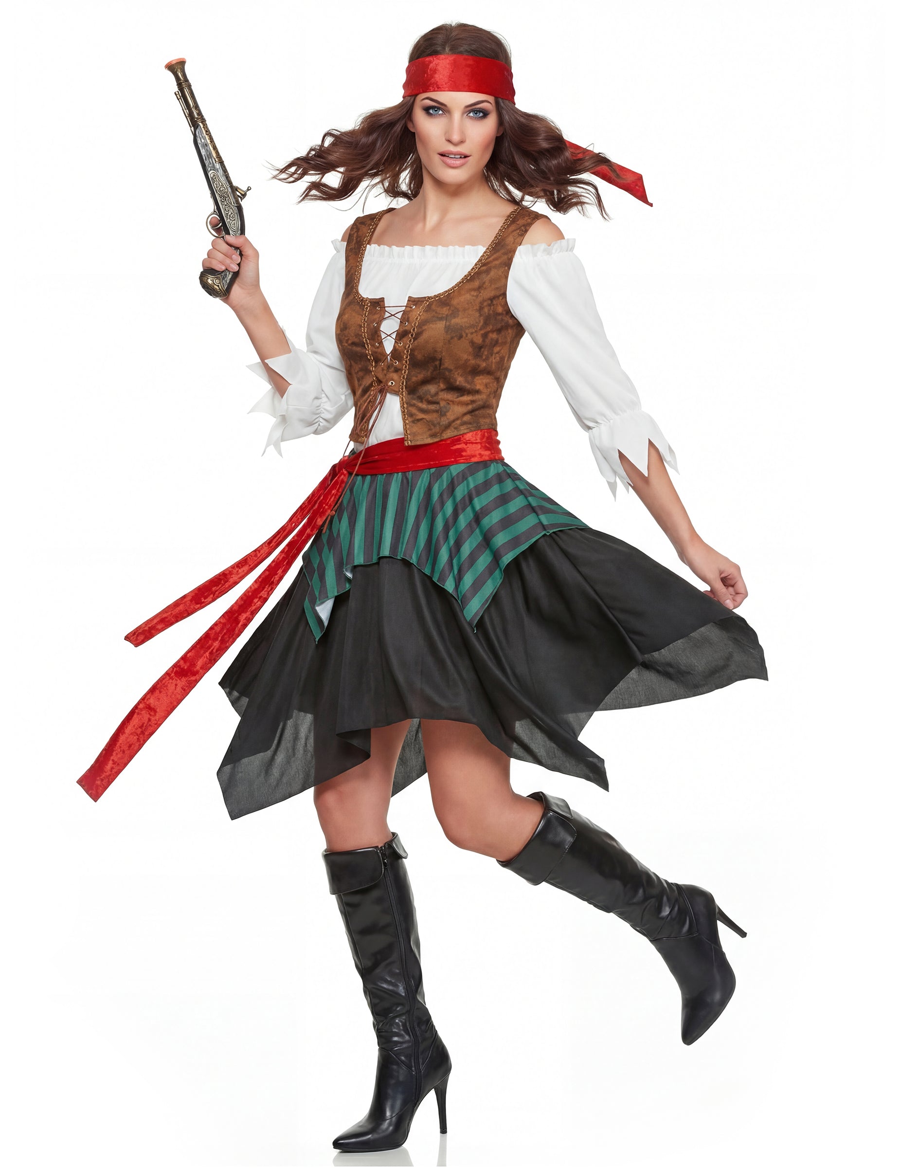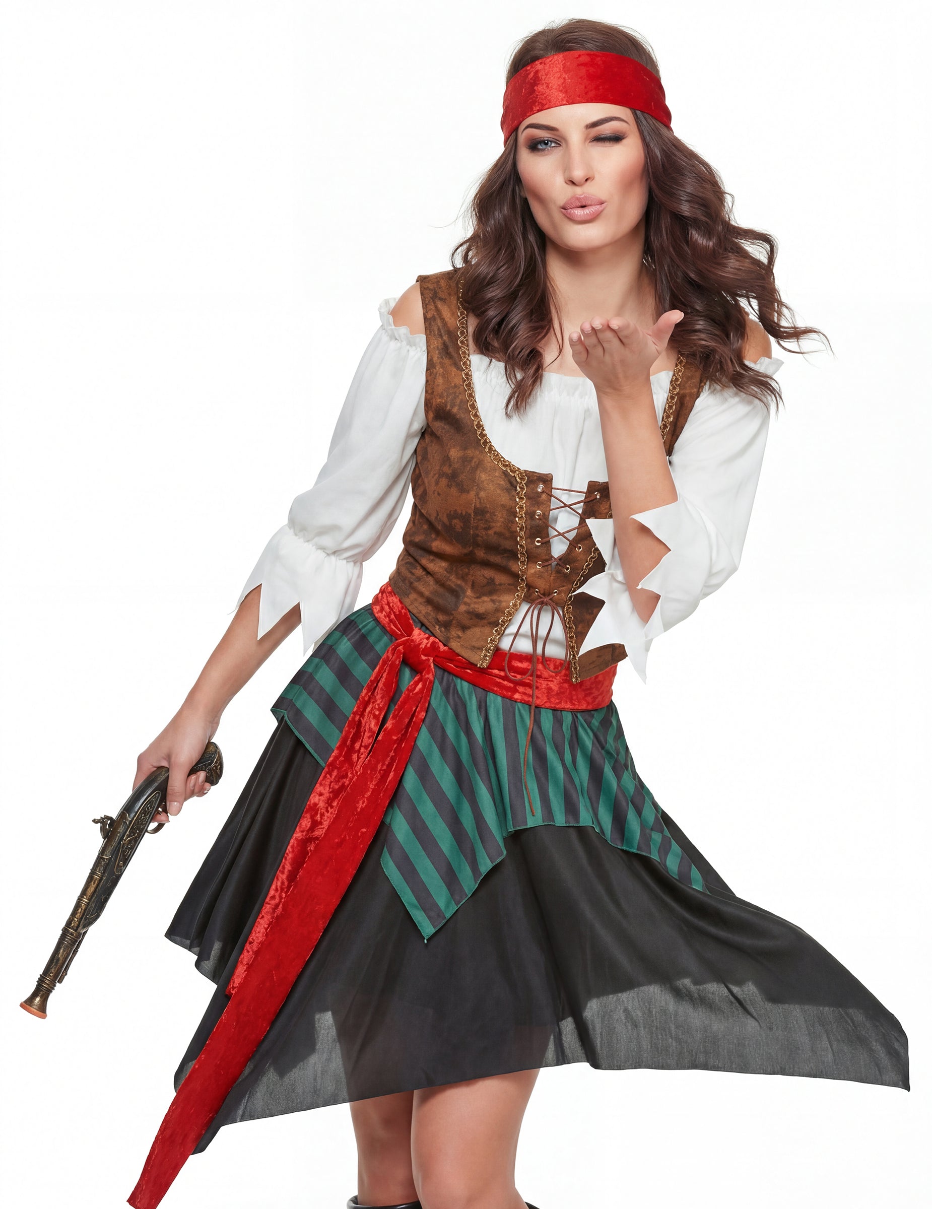 Това пиратски костюм За жени включва пола, колан, високо, жилетка и лента за глава.