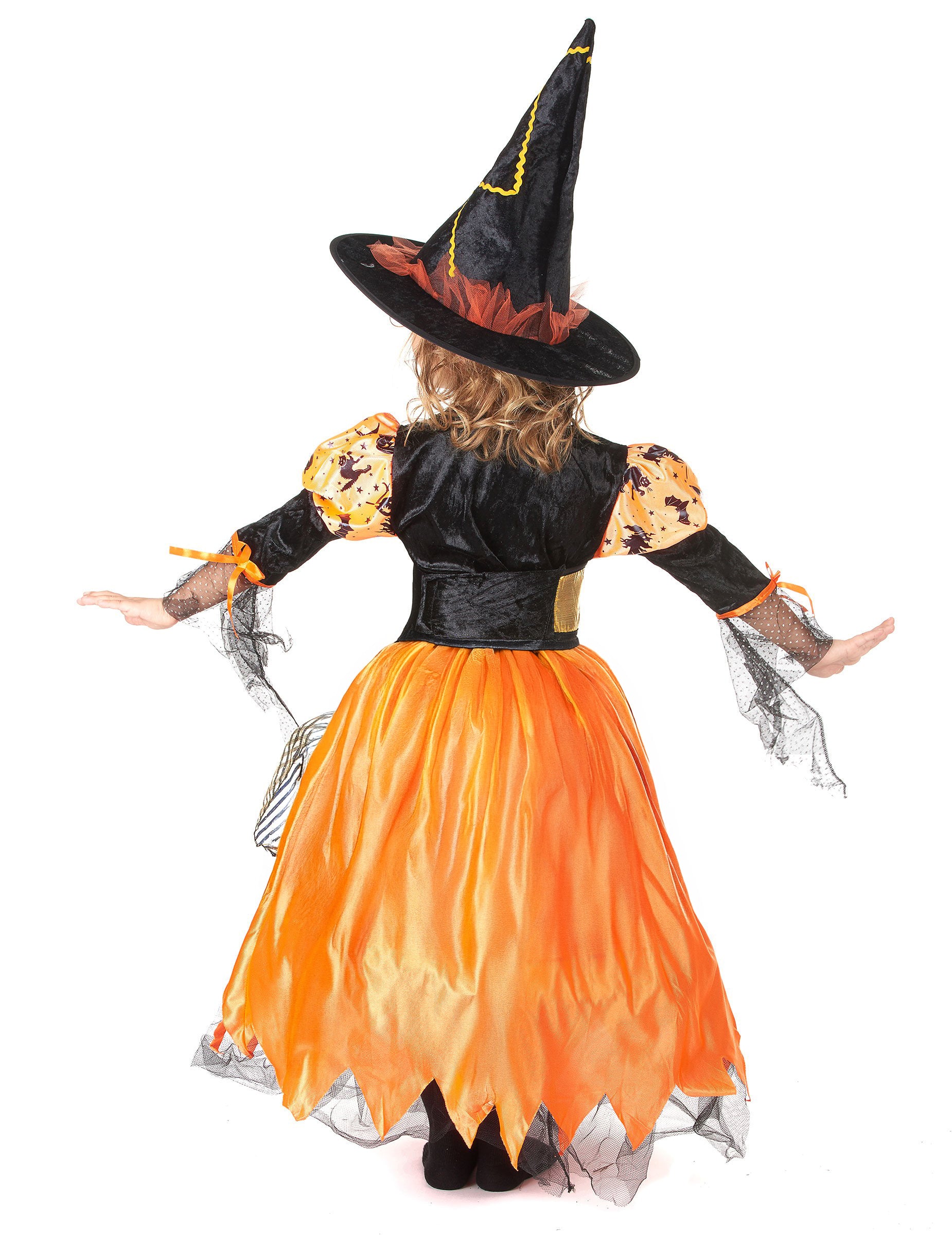 Този костюм за Хелоуин вещици е за момиче и включва рокля, колан и шапка. Роклята има много доста черни модели на Хелоуин на оранжев фон. Tulle и Velvet имитацията се редуват, за да се създаде много качествен ефект. Пластмасов обръч, присъстващ под роклята, ще даде обем на цялото. Коланът, за да се надраскате, ще бъде огънат с размера. Тя е блестяща златиста с фалшива облицовка отпред. Шапката, съответстваща на останалата част от маскирането, ще донесе само клас. Този качествен костюм ще бъде идеален за това да направите дъщеря ви най -хубавите вещици, за да вземете бонбоните в Хелоуин вечер!