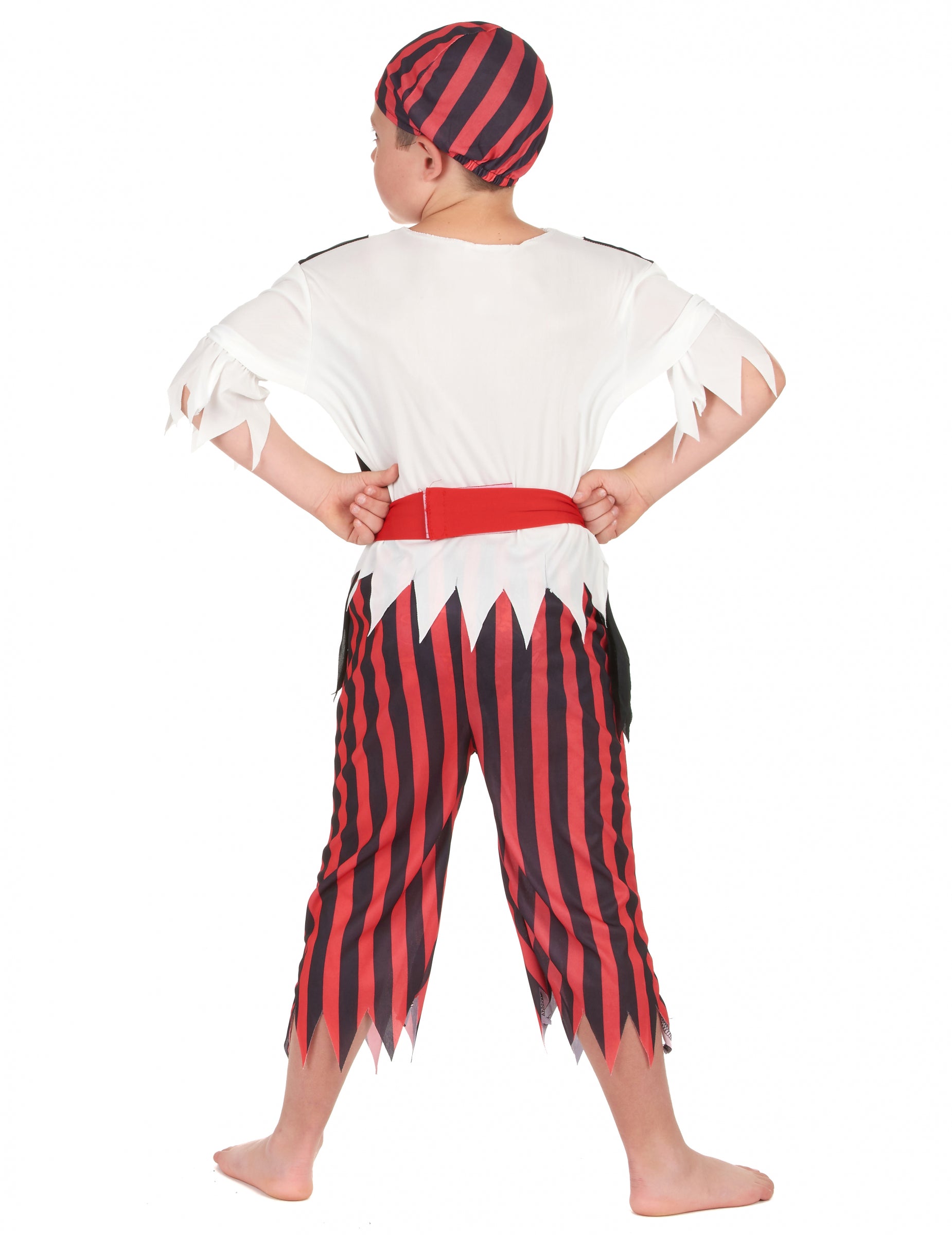 Тази пиратска маскировка за момче е съставена от бяла тоалетна блуза с елече на яката и 3/4 ръкави. Черна жилетка, върху която се отпечатва череп, е пришита само в предната част на блузата. Облеклото включва също червени и черни и еластични панталони в кръста, съвпадаща бандана, както и червен колан за надраскване около кръста (остава не включен). Този костюм е идеален за карнавал, шоу или друго прикрито събитие.
