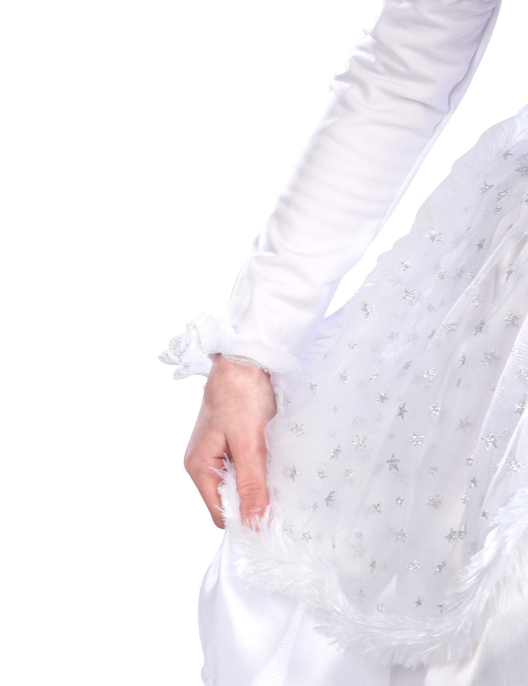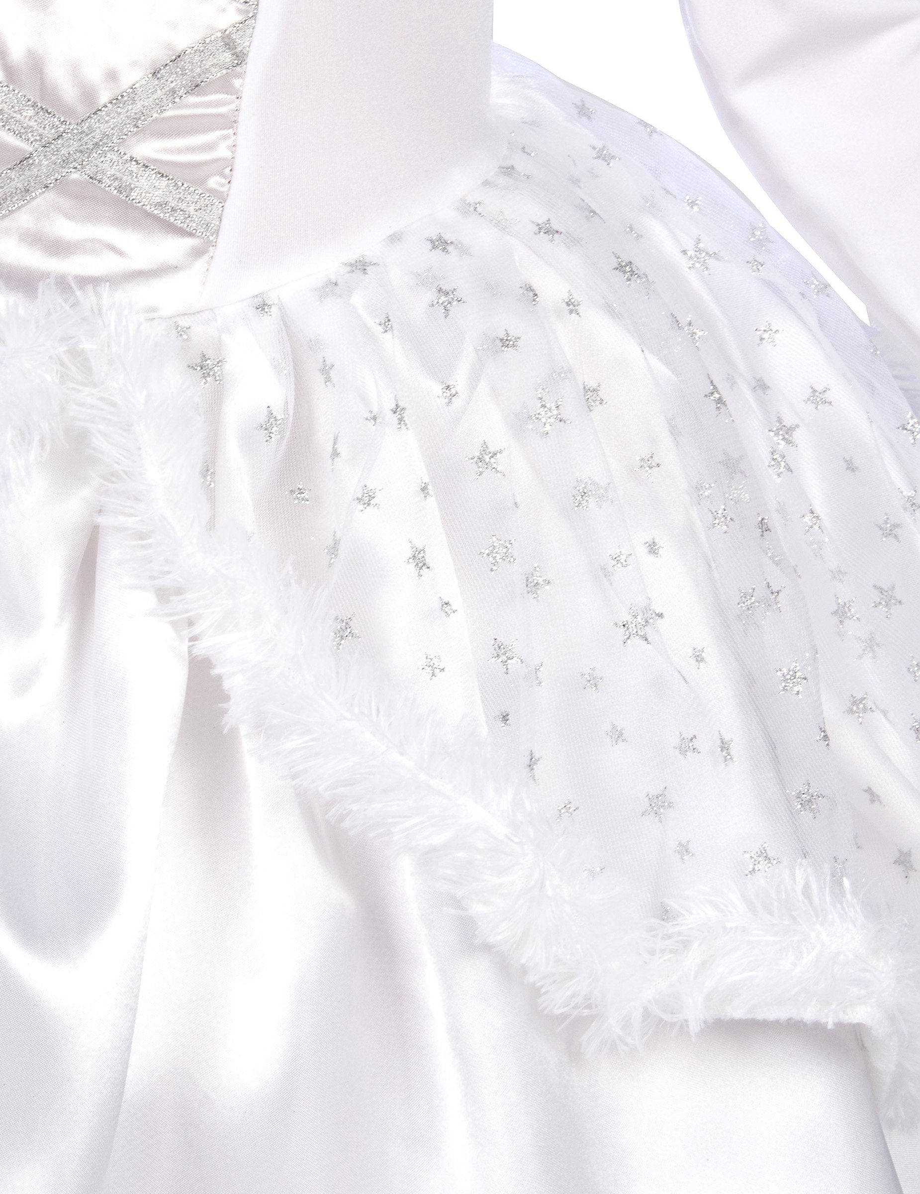 Този бял ангелски костюм за момиче се състои от сатенена рокля с много прецизни завършеци, презрамки, покрити с пера, и деколте сребристи кантове.