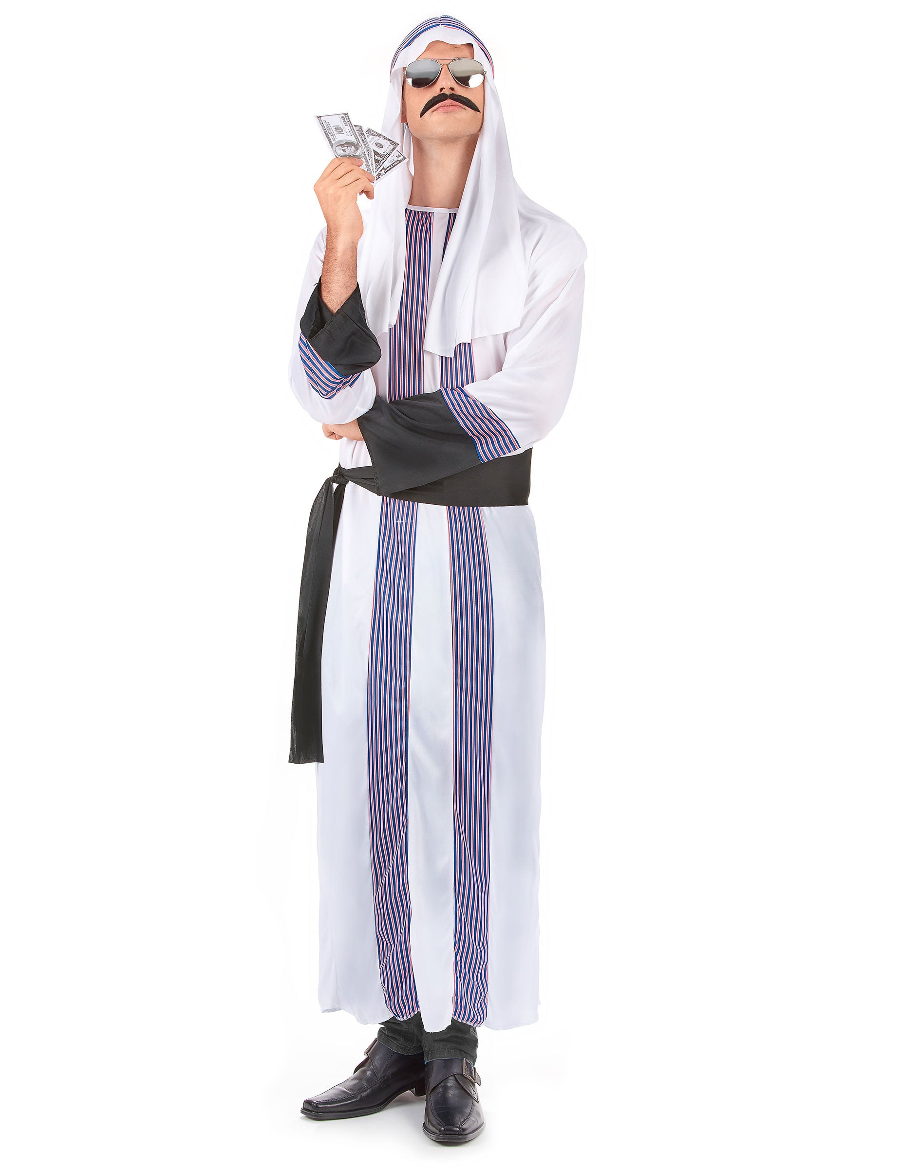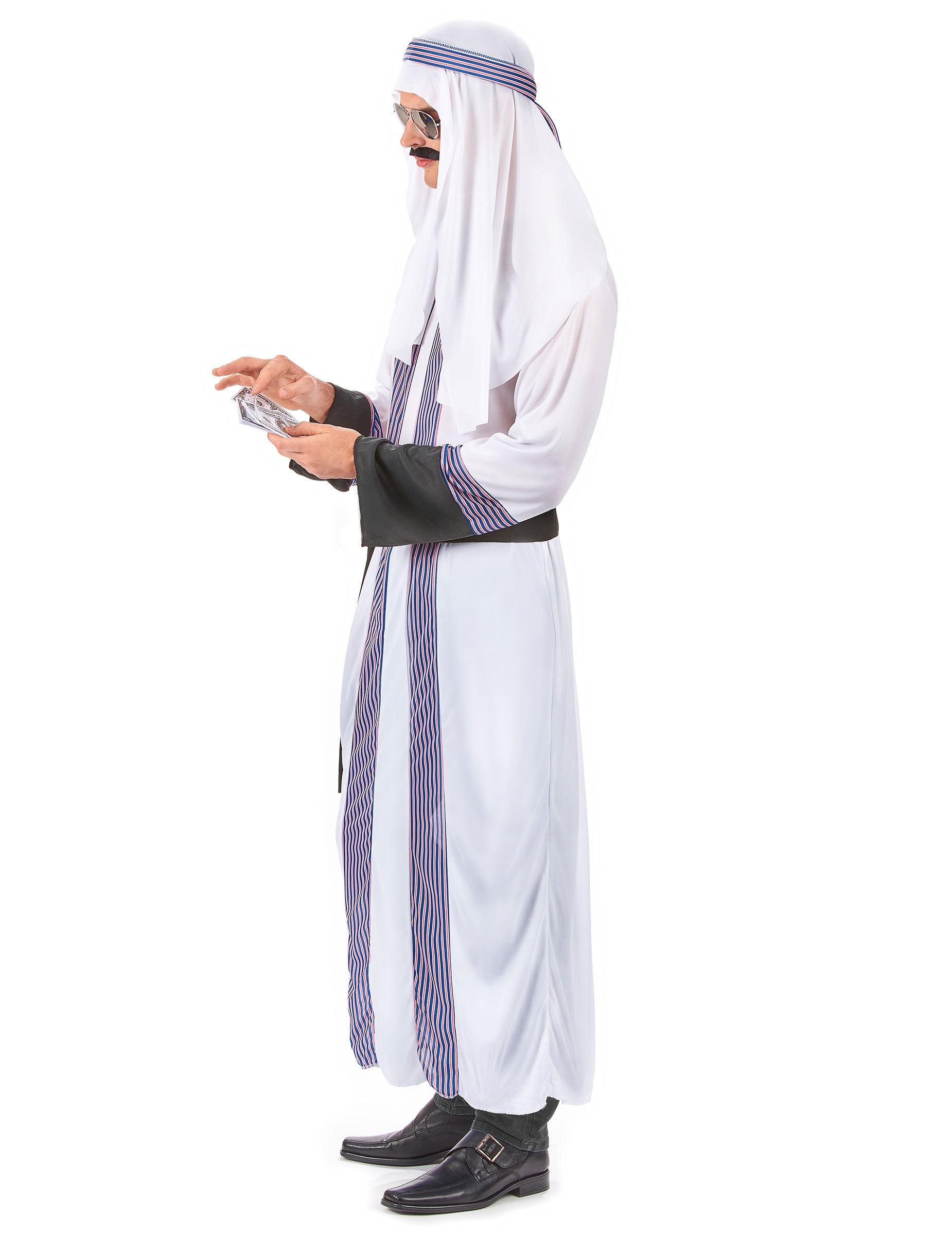 Тази маскировка на арабския шейх се състои от дълга раирана бяла туника и съвпадаща капачка с черен колан (очила, мустаци, билети и обувки, които не са включени). Този полиестер костюм е с отлично качество. Той е идеален за тематични вечери, за шоу или карнавал.