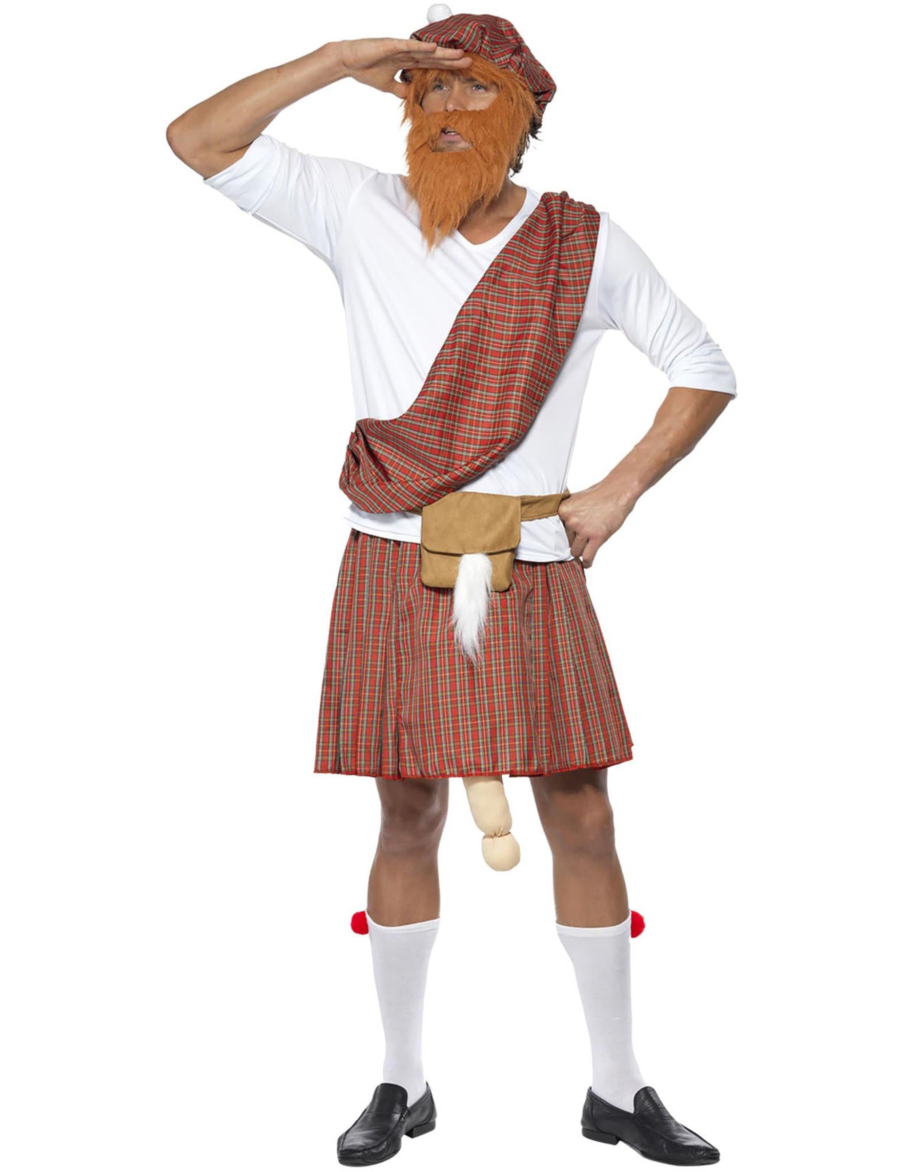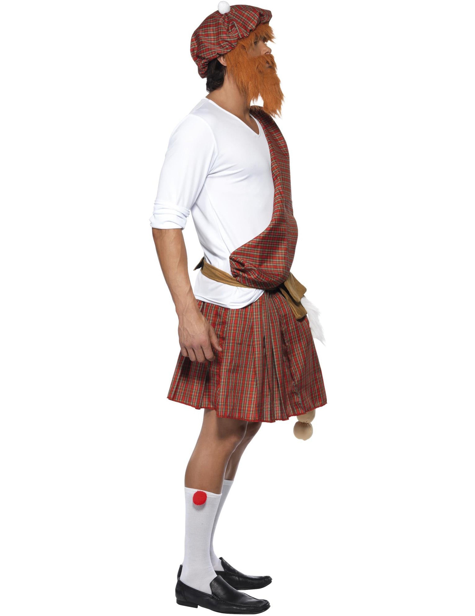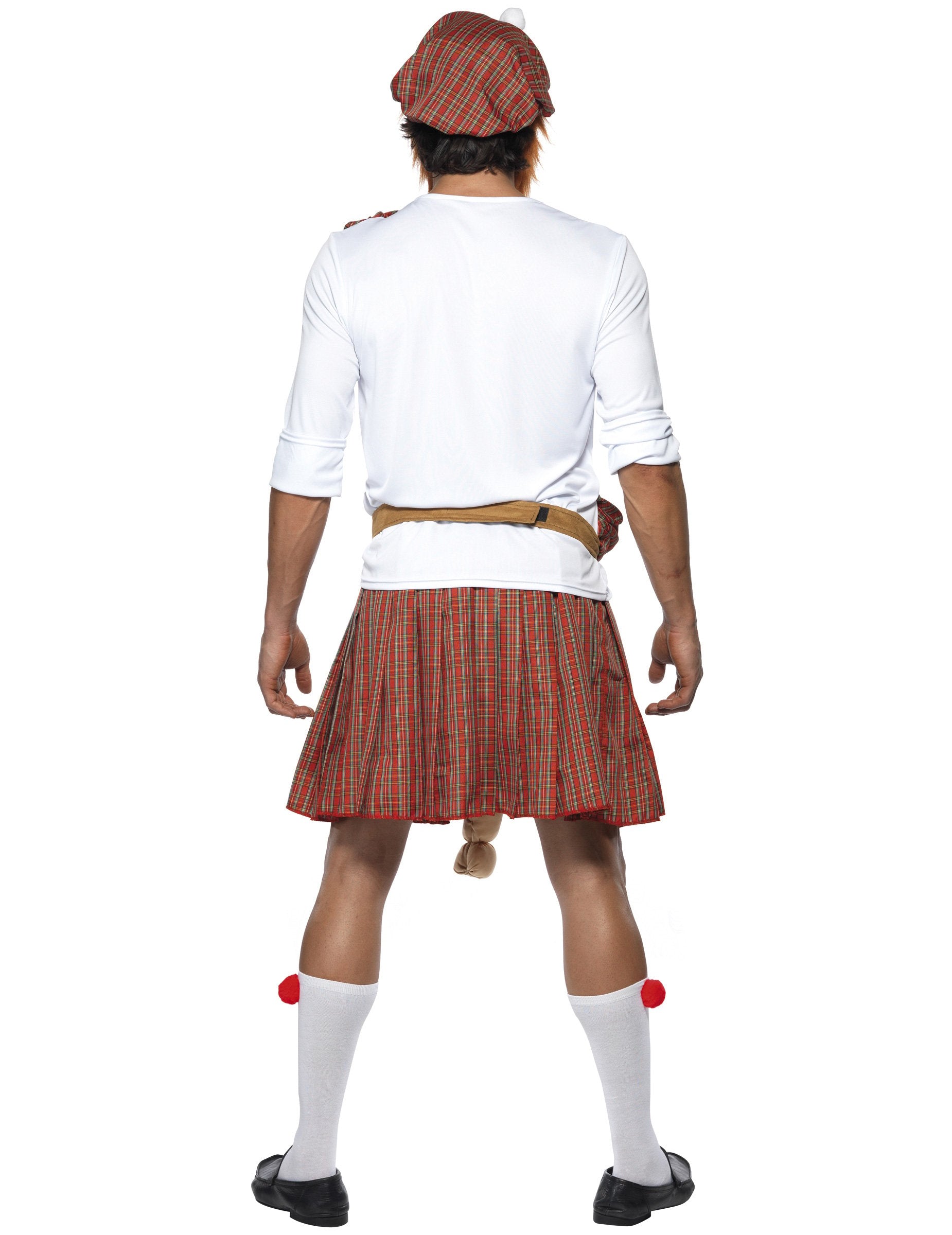 Тази хумористична шотландска маскировка се състои от шест елемента. Бяла тениска с къси ръкави, върху която е вързана килт с точни облицовки, варираща от чифт с шапката, върху която присъства косата. Червена брада, която е лесна за носене благодарение на малки еластични ленти. Колан с фалшив секс се регулира благодарение на драскотината. Предлага се и чифт бели чорапи (обувките не са включени). Този костюм е идеален за оживяване на прикритите ви вечери, особено по време на Сейнт Патрик и да накара всички ваши приятели да се смеят.