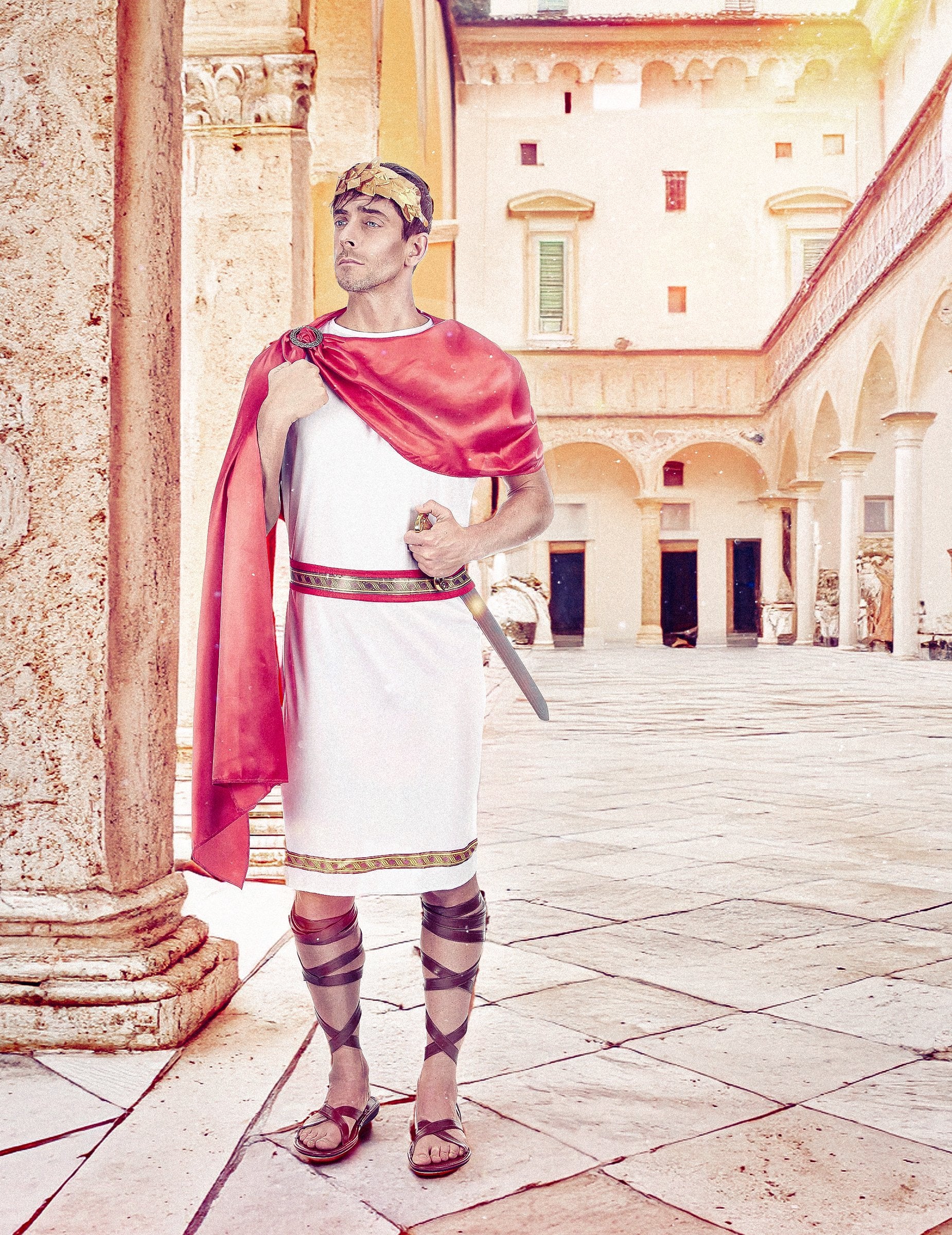 Този костюм за възрастни румъни се състои от туника с нос, колан и лента за глава. Бялата тога е достатъчно и лека. На дъното се пришива лента от златна тъкан с древни шарки, за да придаде шик въздух на тази рокля. Една дантела ви позволява да затворите яката във врата. Червеният плат нос се провежда около шията, за да падне върху раменете. Пластмасов контур действа като фалшива вратовръзка. Червеният и златист колан е вързан отзад с бели панделки. Лентата за глава представлява корона от листа от златни заливи. Този костюм е идеален за въплъщение на истински римлянин по време на прикритите ви вечери, за шоу или карнавал.