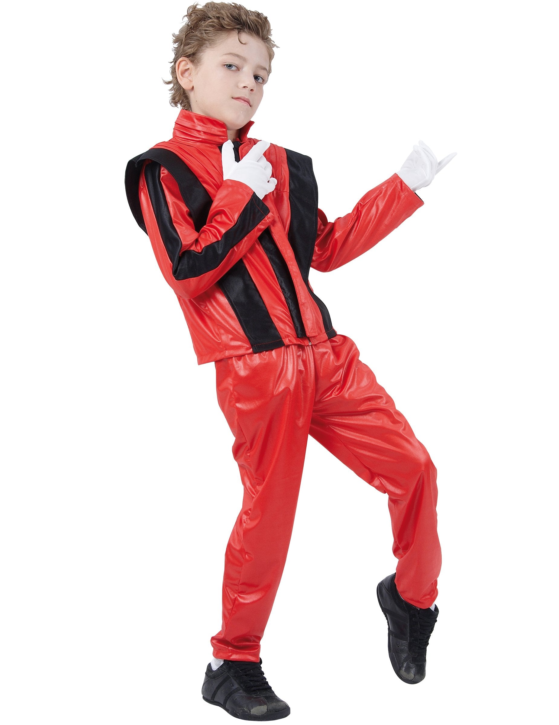 Костюмът на тази детска поп звезда включва яке и подходящи панталони. Яркочервеното сако, украсено с контрастни черни ивици, напомня за емблематичния стил на най-големите музикални легенди. Със своята висока яка и маркирани подплънки, той носи нотка харизма и елегантност. Червените панталони, съчетани със сакото, са едновременно плавни и удобни, идеални за придружаване на най-дивите танцови движения. Този костюм е идеален за ролята на звезда по време на карнавал, шоу или костюмирано парти. Вашето дете ще бъде готово да блесне под светлината на прожекторите!