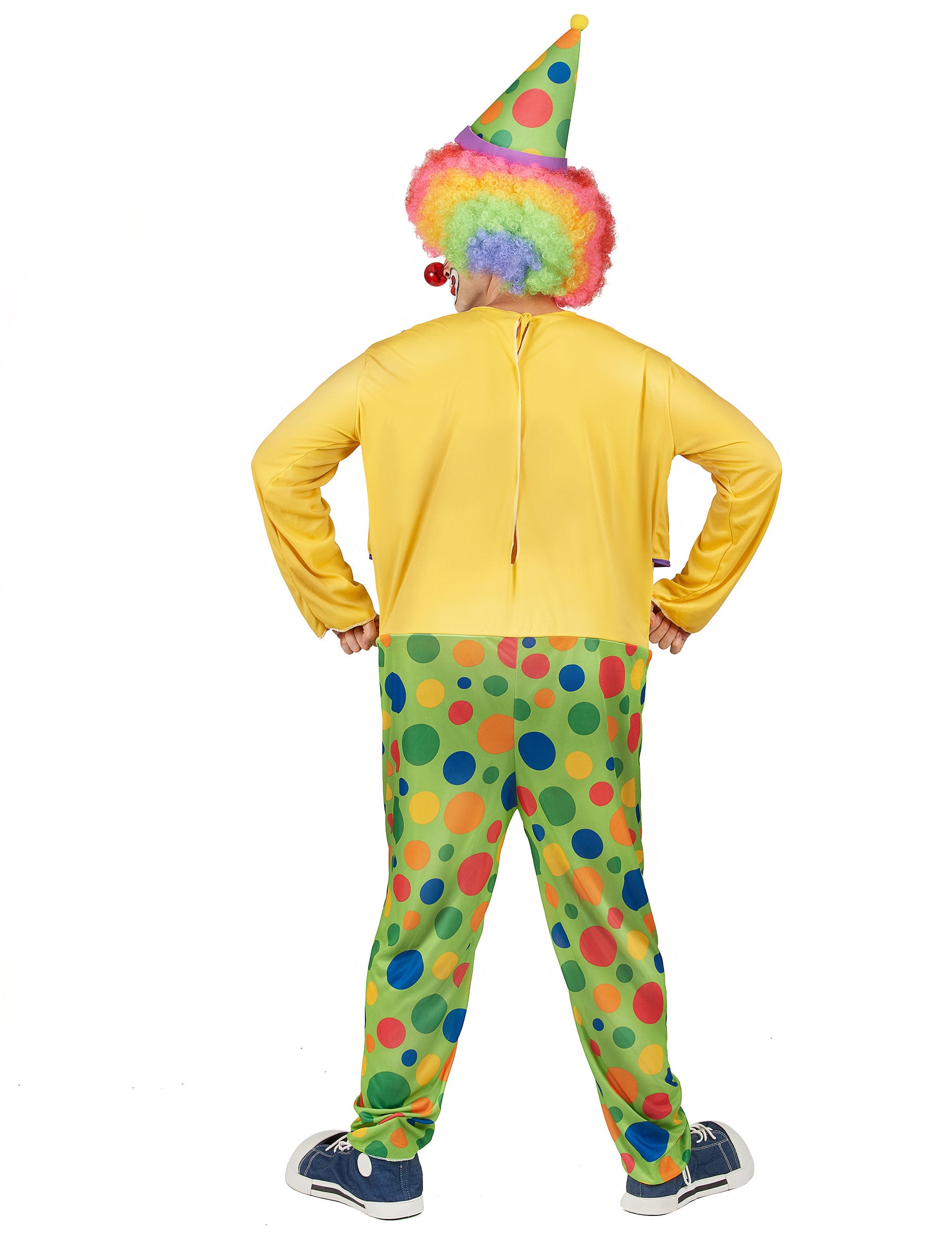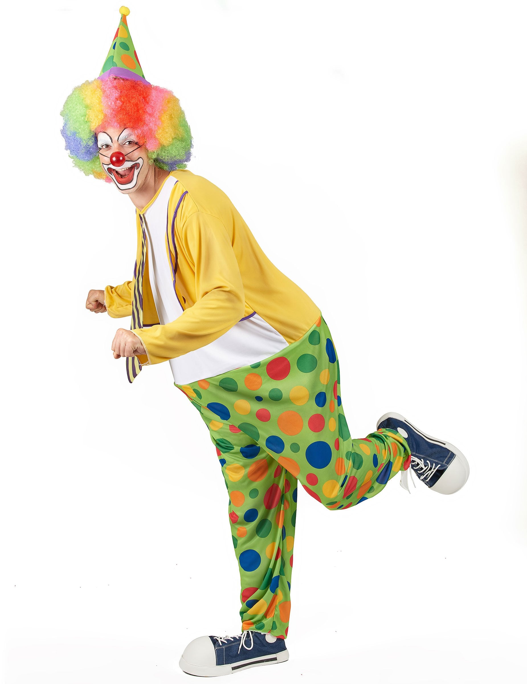 Този костюм на клоун е съставен от комбинация, която да бъде поставена на краката и държана от възел зад врата ви. Горната част е бяла с жълта жилетка, пришита върху него. Вашата яка ще бъде украсена с фалшива раирана вратовръзка, а панталоните ви ще показват много доста многоцветни грахови грахови грахови грахови плодове. Вашият костюм ще бъде завършен от доста заострена шапка от пяна, покрита с многоцветна материя от полка точка и преодоляна от жълта помпом. (Перука, червеният нос и обувките не са включени). Поводът на карнавала или за ден за рожден ден, този пъстър костюм ще бъде идеален за правене на млад и стар Сей.