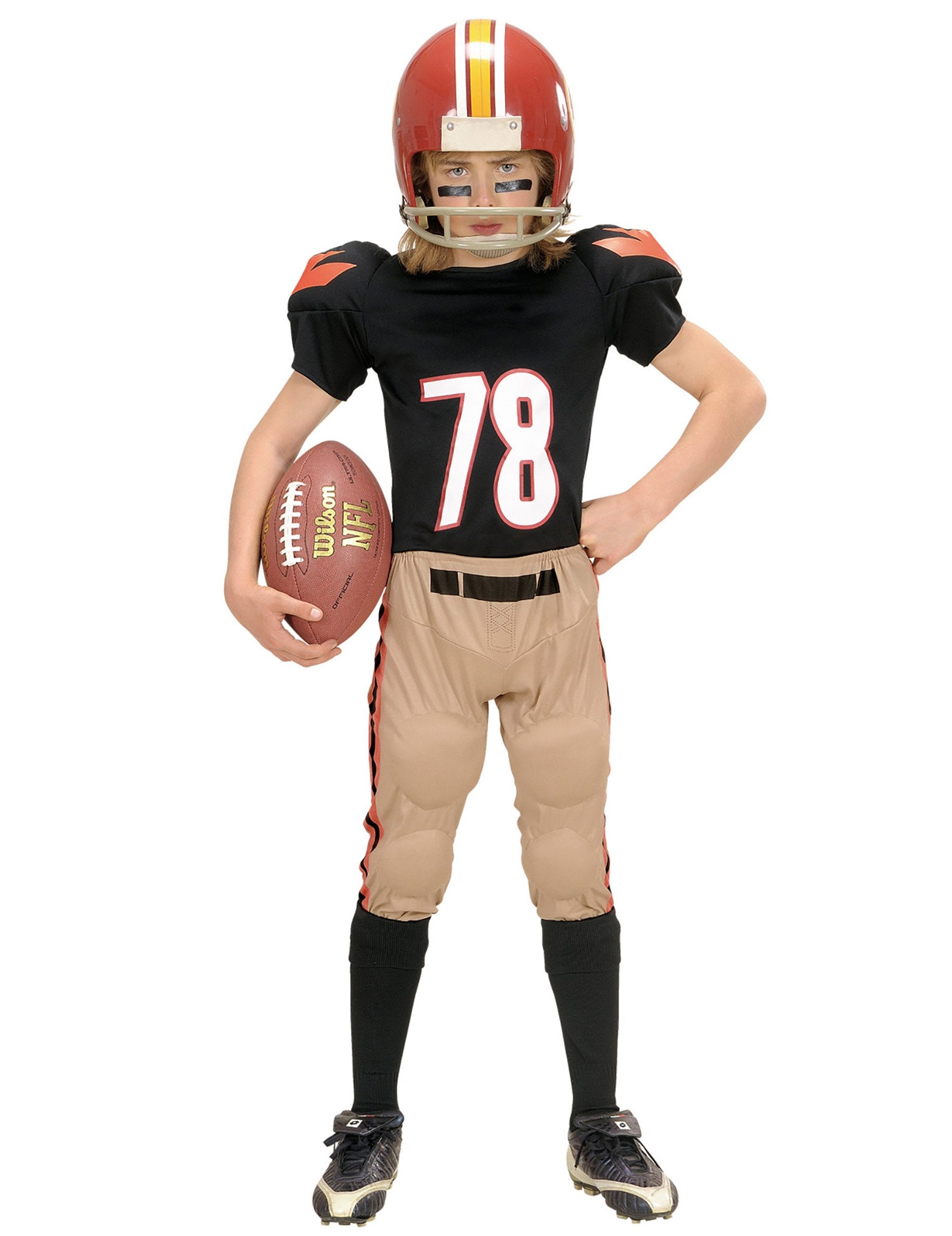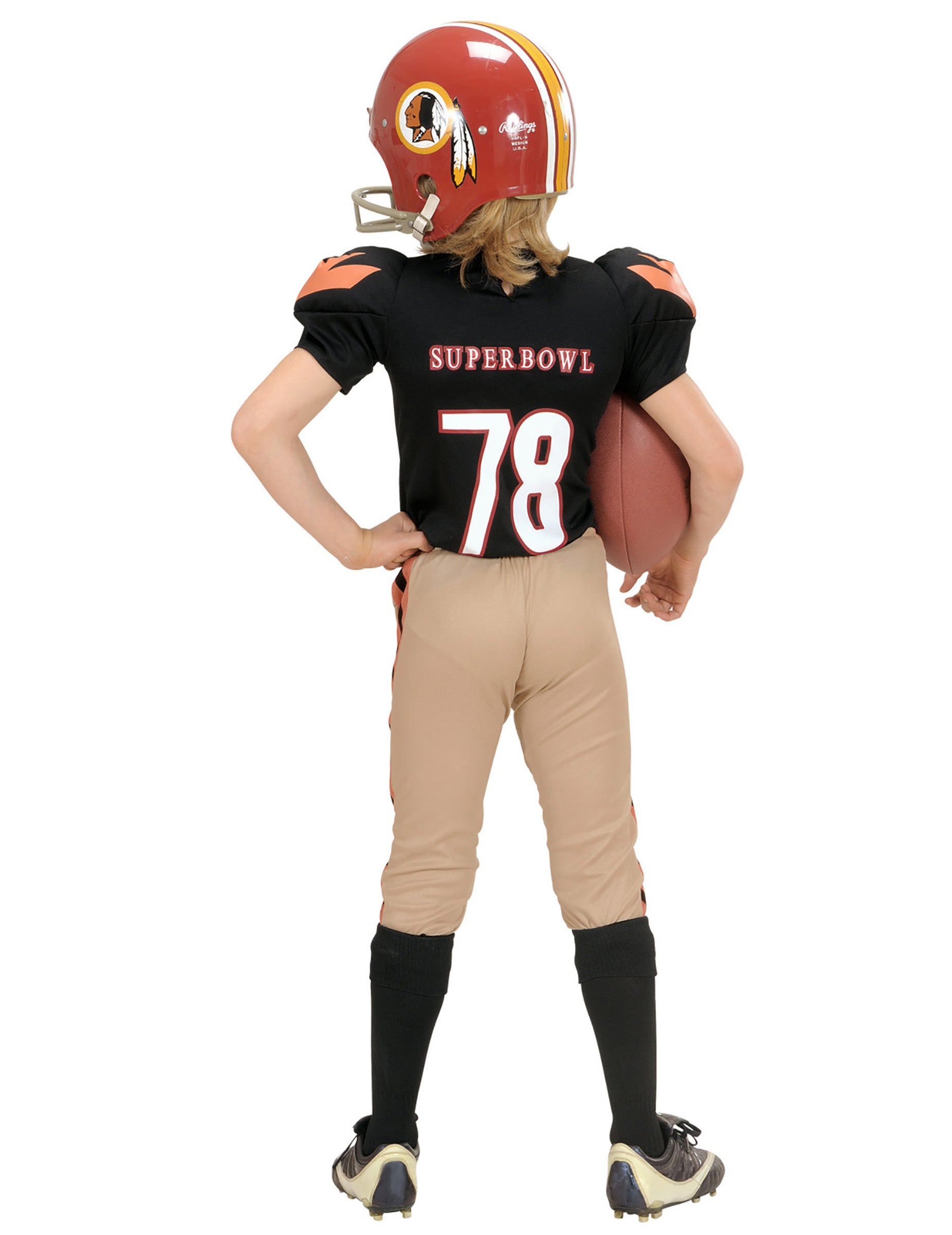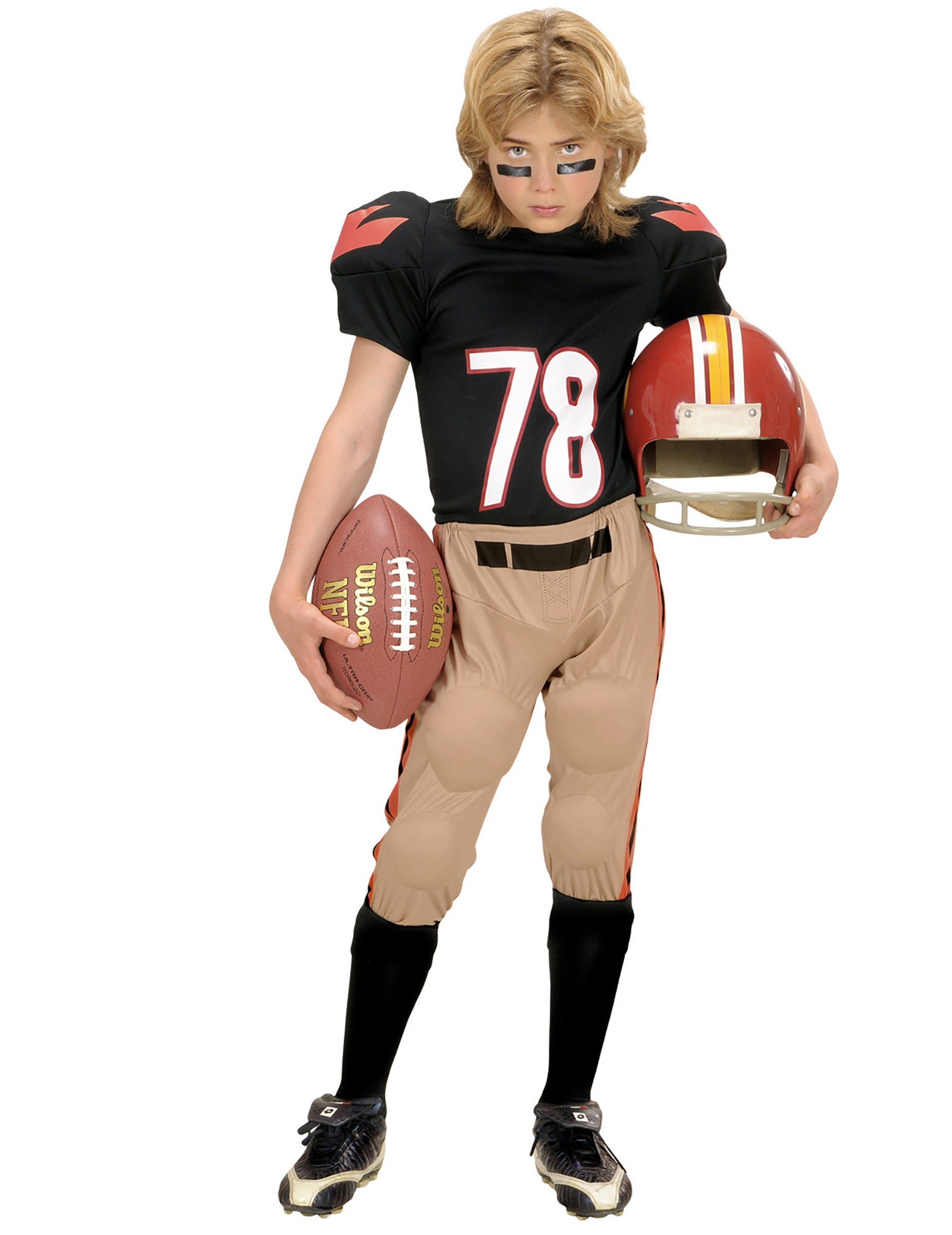 Костюмът на този американски футболист за момче се състои от тениска и панталони. Тениската е подплатена с раменете и е еластична, за да се адаптира към морфологията на вашето дете. Панталоните, също еластични, съвпадат и пристигат точно под коленете (шлем, балон, грим, чорапи и обувки не са включени). Този костюм ще бъде идеален за карнавал или за всяко друго прикрито събитие. Copyright Widmann Srl. Copyright Widmann Srl