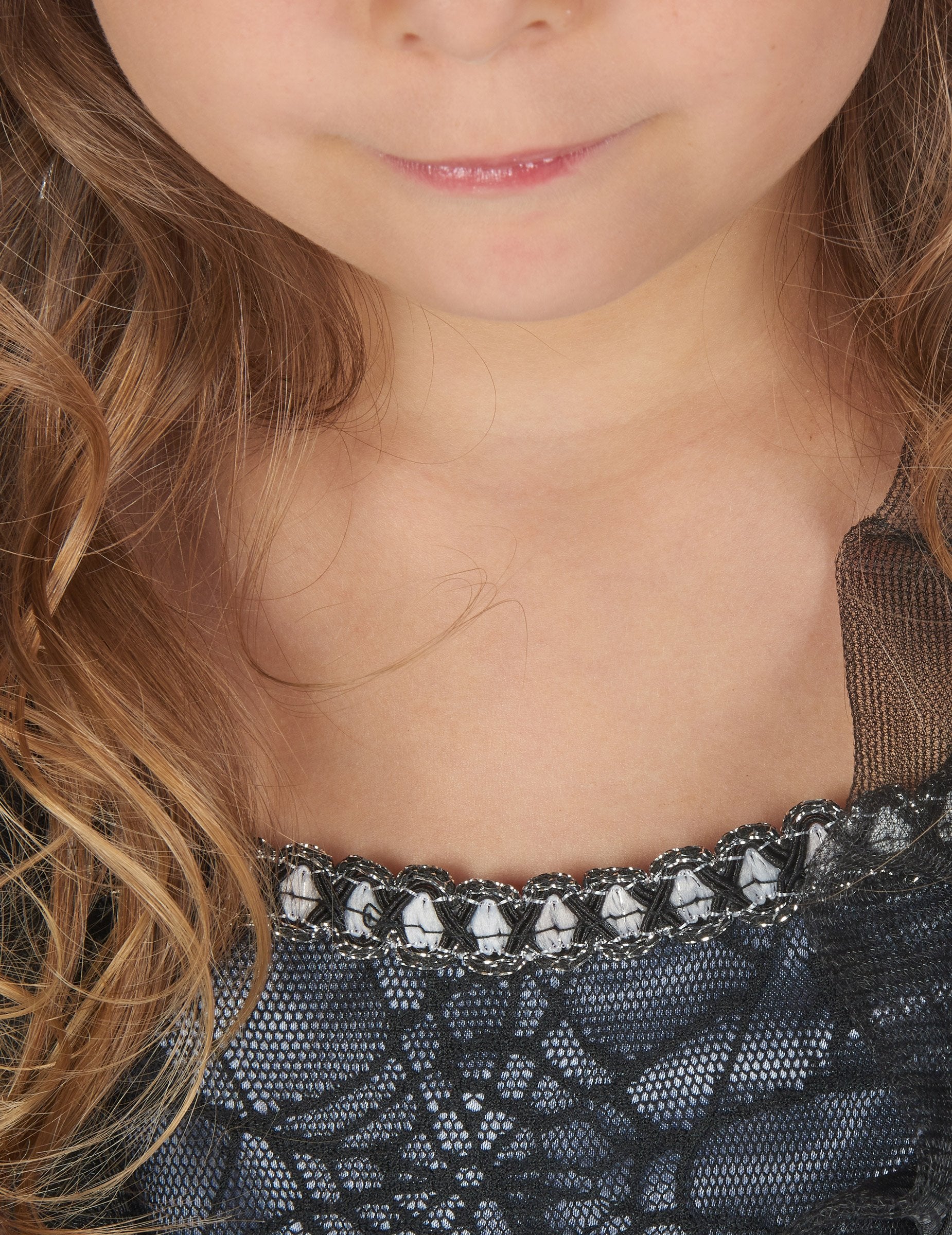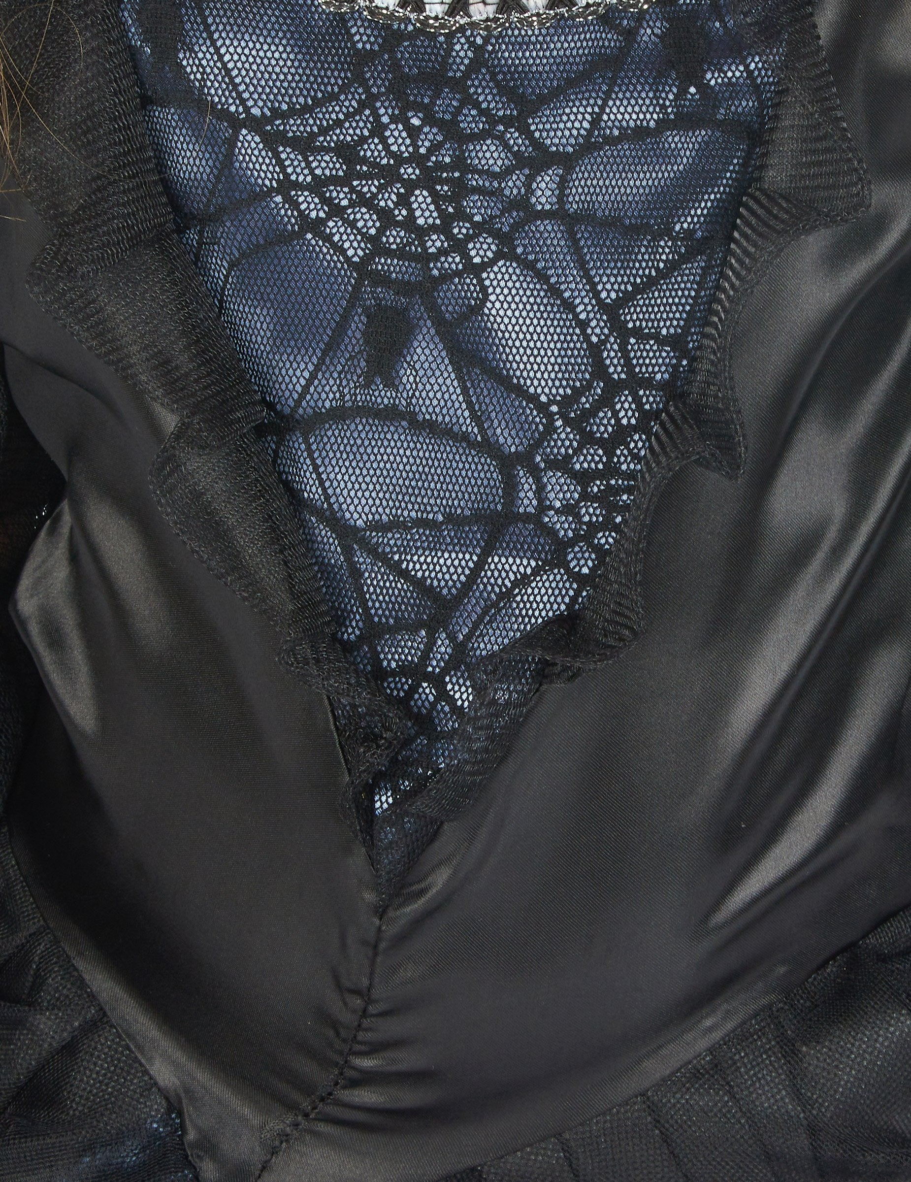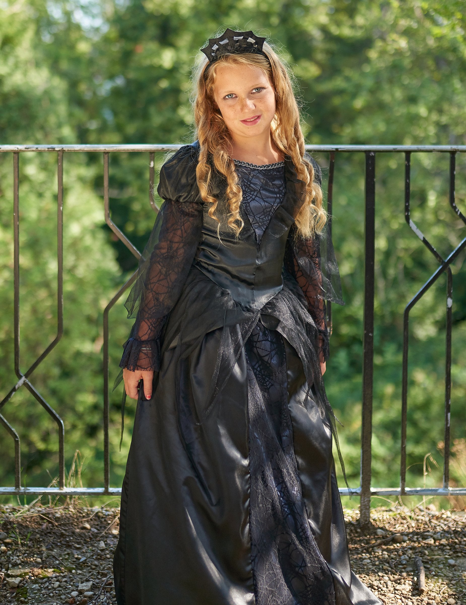 Този Comtesse Vampire for Girl маскировка се състои от черна рокля, фуста и тиара. Роклята е дълга, мека и копринена и 101 см дълга. Той е черно и сатенено полунощно синьо. Ръкавите са дантелени, а платите се пришиват на роклята. Петикоатът е еластичен в кръста и има обръч, който дава обем на роклята. Детето ви ще бъде най -красивото с неговия костюм на вампира за Хелоуин.