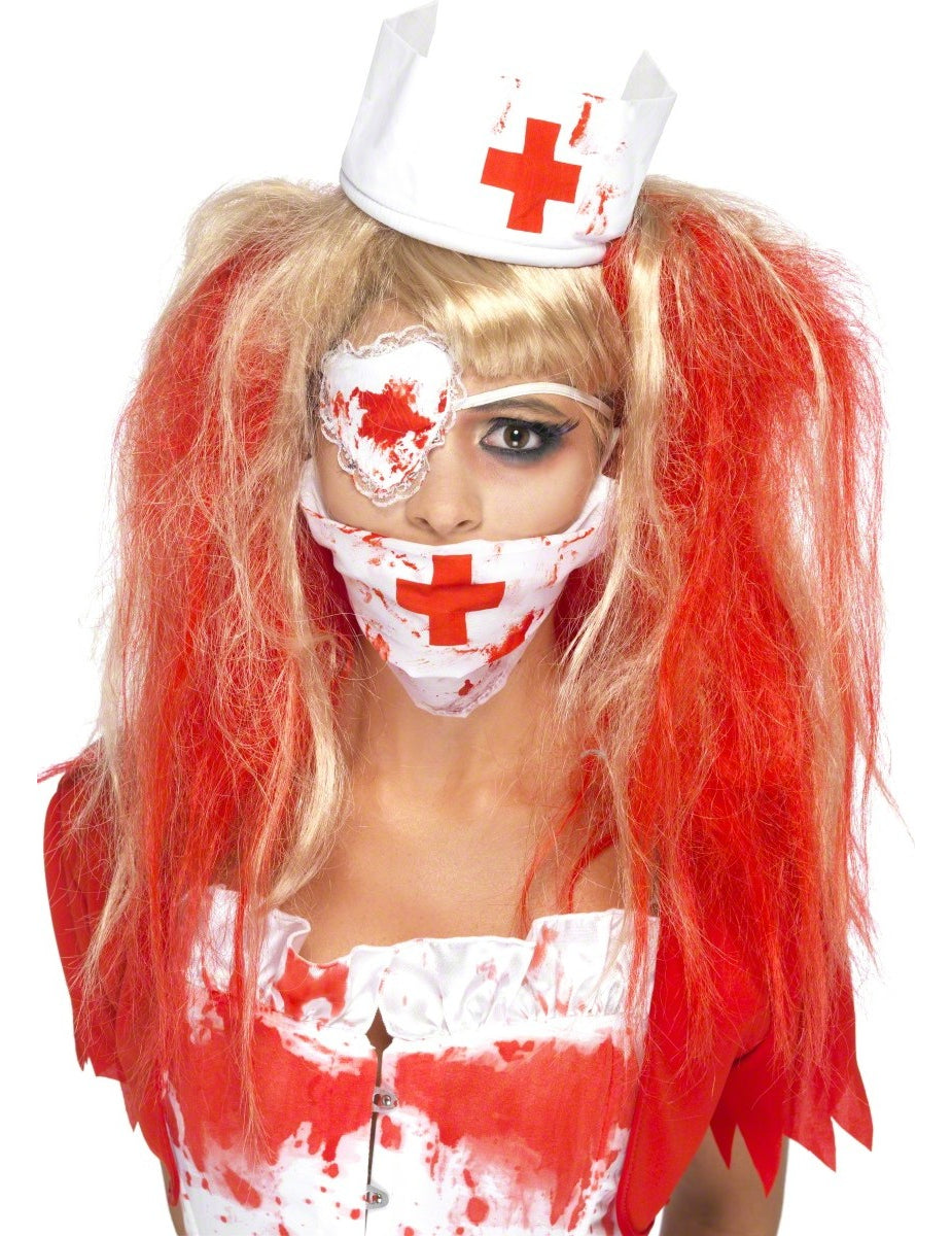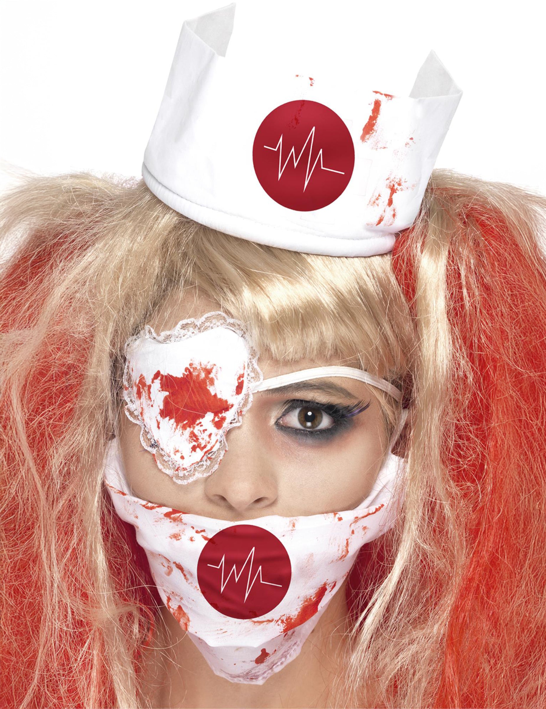 Този комплект за медицински сестри за жени се състои от кеш с дантела, маска и лента за глава с шапка. Тези елементи имат червени петна за кървав ефект. Този комплект е идеален за завършване на вашия костюм за Хелоуин или по време на прикрито събитие.