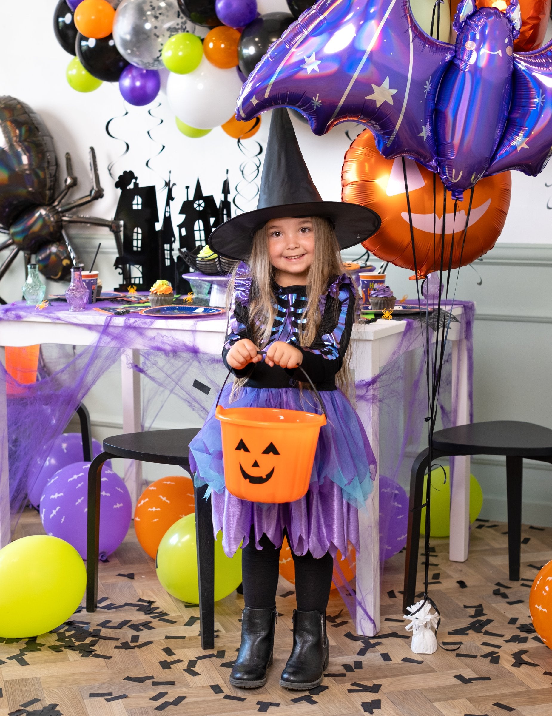 Тази тиквена кофа 17 cm Ще придружи перфектно малките чудовища при тяхното събиране на страшни лакомства. Неговият ярко оранжев кръгъл дизайн, украсен с класическо лице на Jack-O'-Lantern, създава незабавен визуален ефект. Снабден със здрава дръжка, практично е да се носи през цялата вечер. Перфектният аксесоар за забавно, тематично парти за реколта.