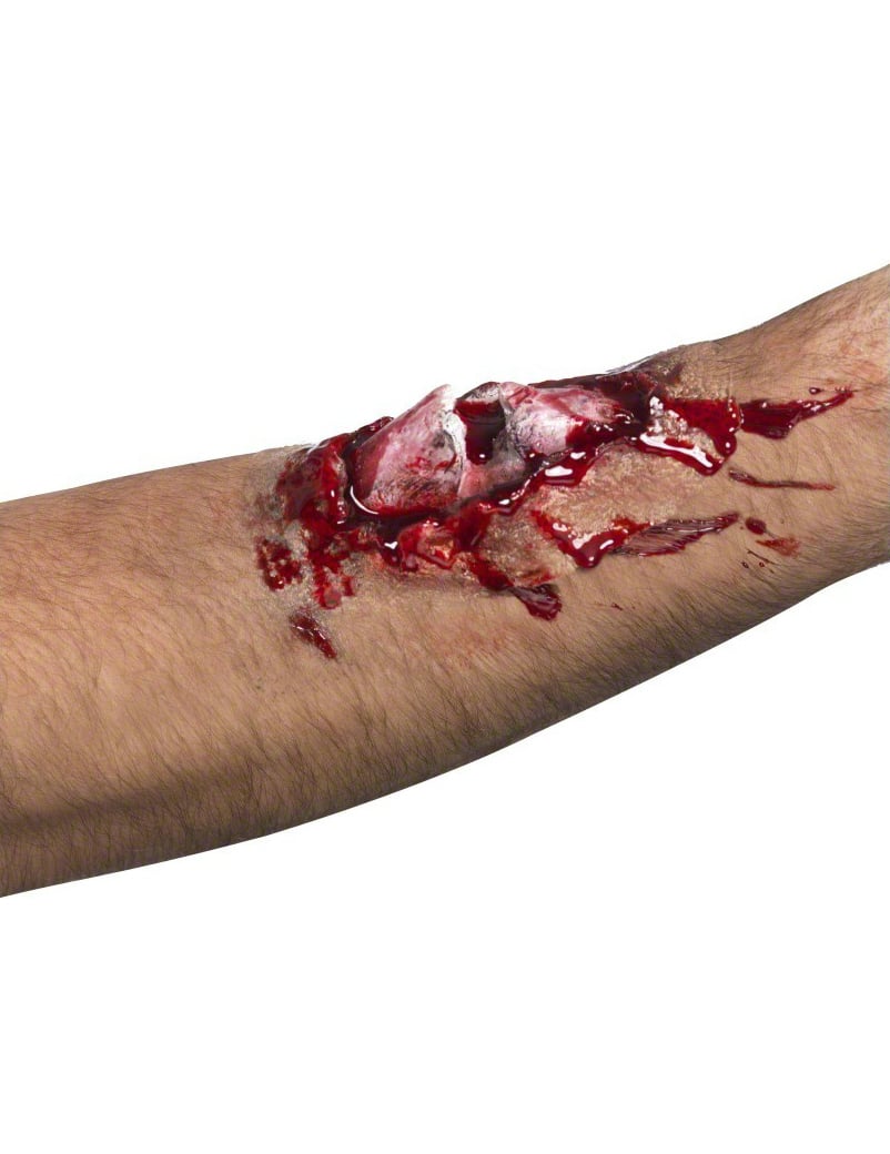 Това фалшиво увреждане на кожата в латекс представлява кървава фрактура на костта. Включено лепило ще го поправи върху кожата ви. Този елемент е идеален за завършване на вашата маскировка за Хелоуин или по време на прикрито събитие.