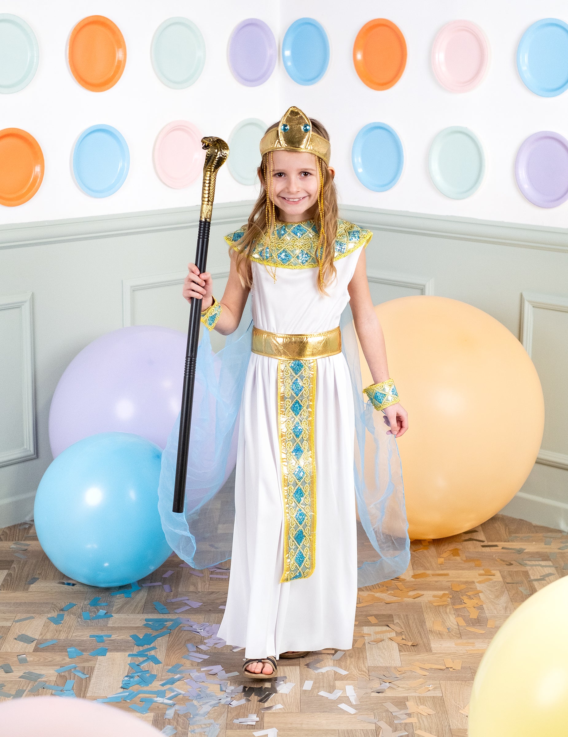 Този превъзходен египетски костюм на кралицата за момиче се състои от рокля, нос, яка, шапка и две гривни. Роклята без ръкави е бяла. Той има много красив колан, декориран с ивици и пайети в златни и сини тонове. Това може лесно да се постави благодарение на отвор отзад, който се затваря с помощта на драскотини. Проходът и двете гривни са направени по същия начин като коланът на роклята, а също и близо до драскотини. Поставя се син чист нос и се прикрепя към раменете на роклята и върху гривните чрез система за надраскване. Накрая, златна шапка, украсена с фалшиви перли, завършва цялото. Може да се регулира и затвори с помощта на драскотина. Този костюм ще бъде идеален за въплъщение на великолепна кралица на Египет по време на Карнавала или за всяко друго празнично събитие!