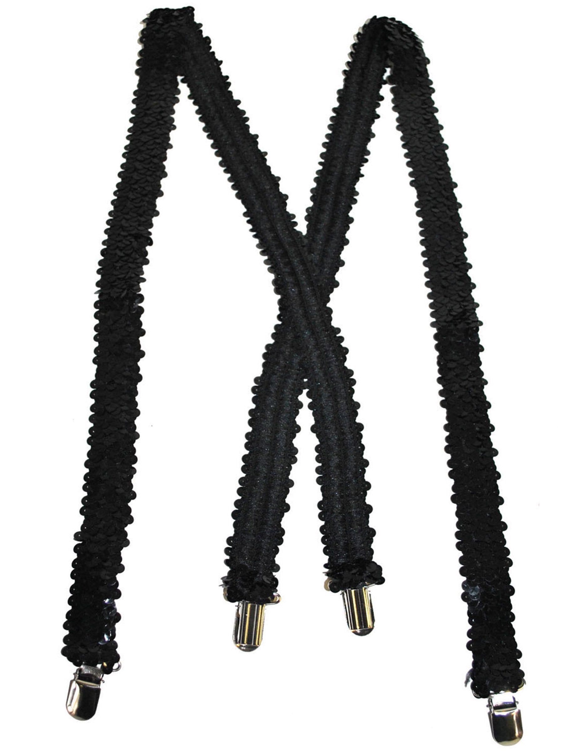 Тази двойка черни каишки за възрастни е съставена от черни пайети. Те са снабдени с метални крепежни елементи. За да оправите панталоните или поли. Тези каишки за пайети ще дават перфектно с различни маскировки за тематични вечери като кабаре, казино, дискотека, ...