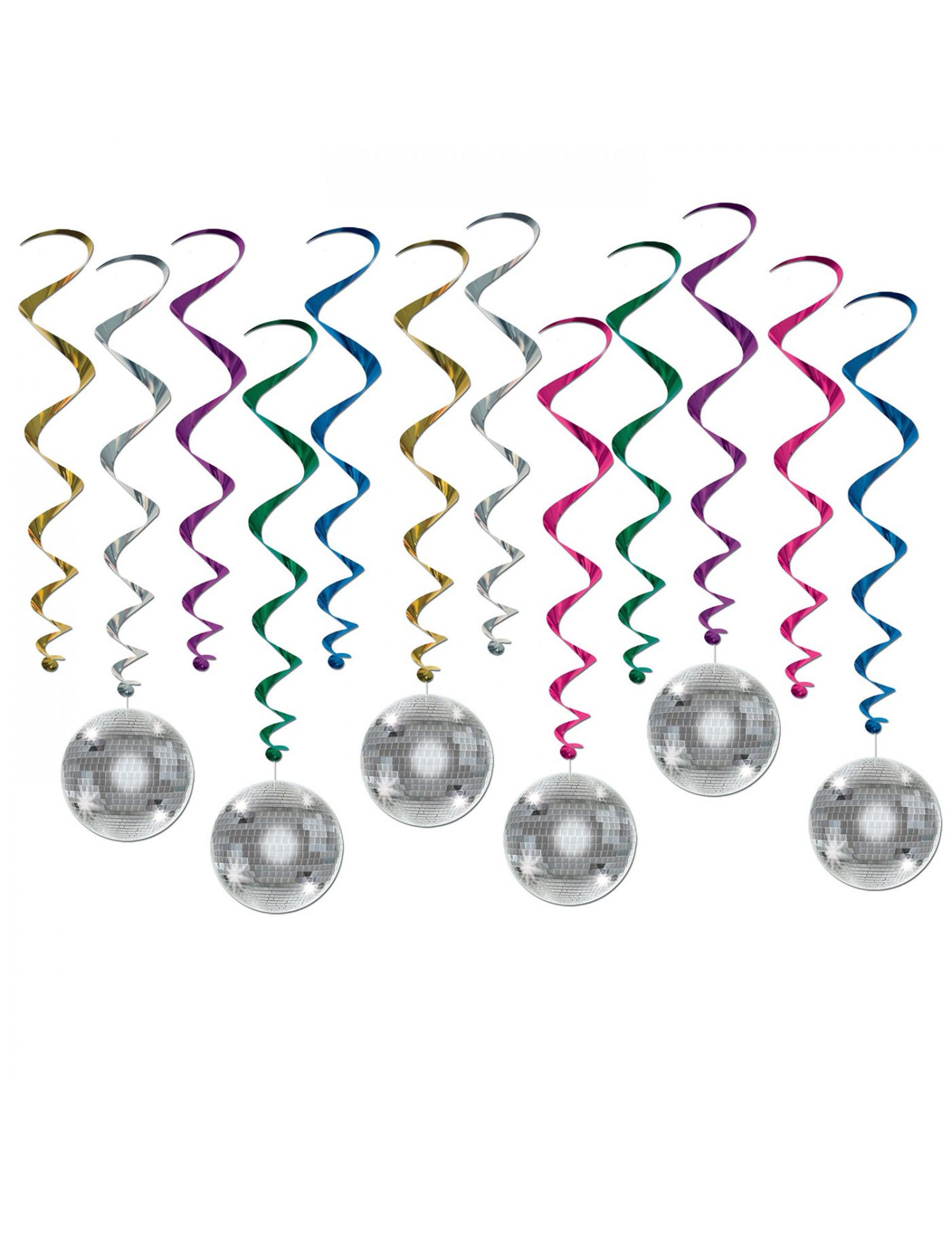 Тази партида има 6 метални вихрови суспензии. Всяко суспензия е с дължина приблизително 101 сантиметра. Ще намерите златен вихър, сребро, лилаво, розово, зелено и синьо. Всяка вихрушка завършва с диско сребърна топка в плосък картон с диаметър около 14,5 см в диаметър. Тази висяща украса е идеална за обличане на стаята ви по време на диско вечер.