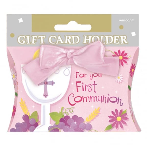 Тази **подаръчна торбичка за момичешко първо причастие** носи надписа "For your first communion" с илюстрации на кръст, потир и цветя. Размерите ѝ **8 x 14 cm** я правят идеален съд за поднасяне на бижу или поздравителна картичка по време на това религиозно тържество.