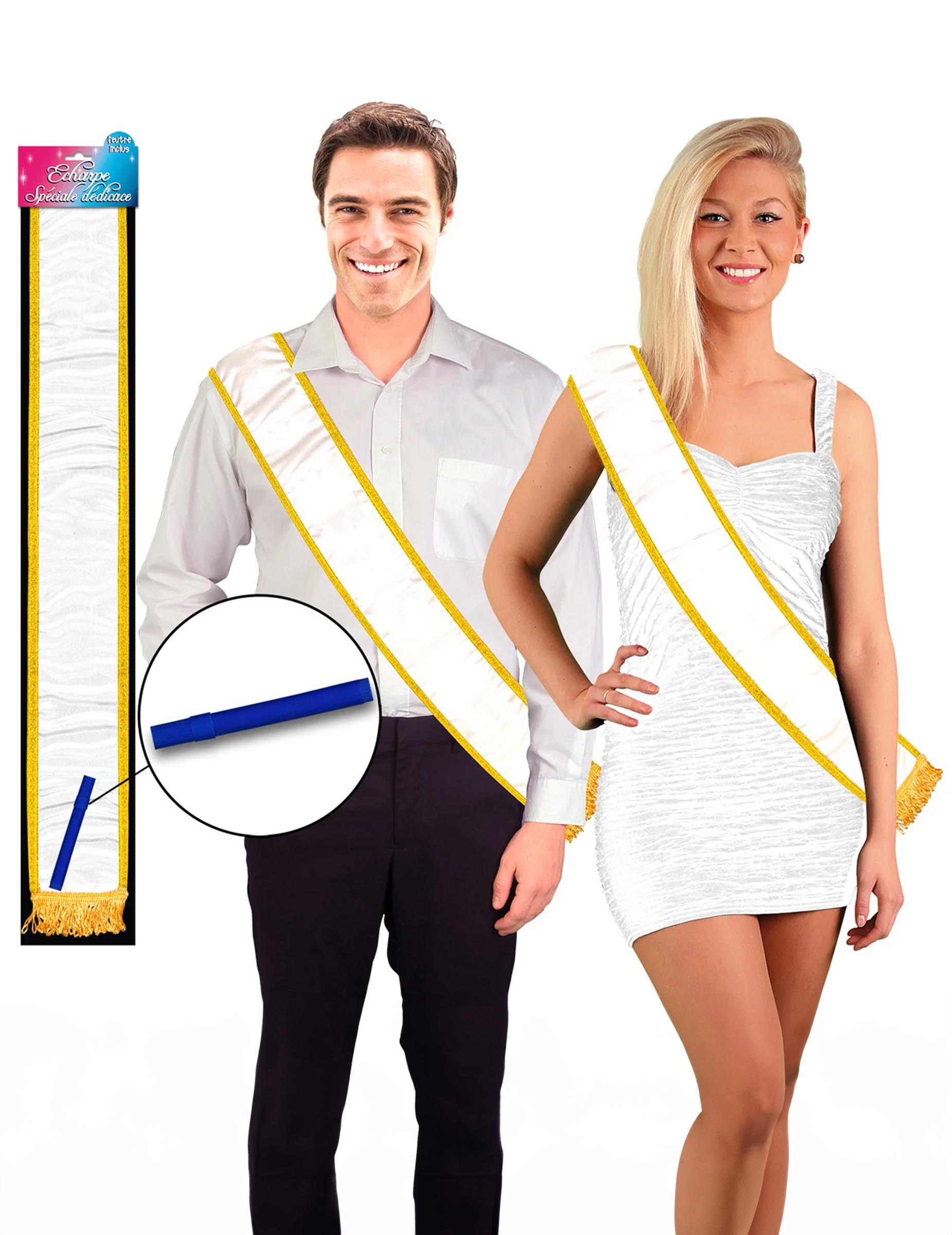 Станете високия авторитет на вашата вечер с този шал Miss. Това е бяло със златни граници. Той е с дължина приблизително 180 см и може да бъде персонализиран с помощта на син филц. Забавлявайте се на следващата си семейна среща или за рожден ден!