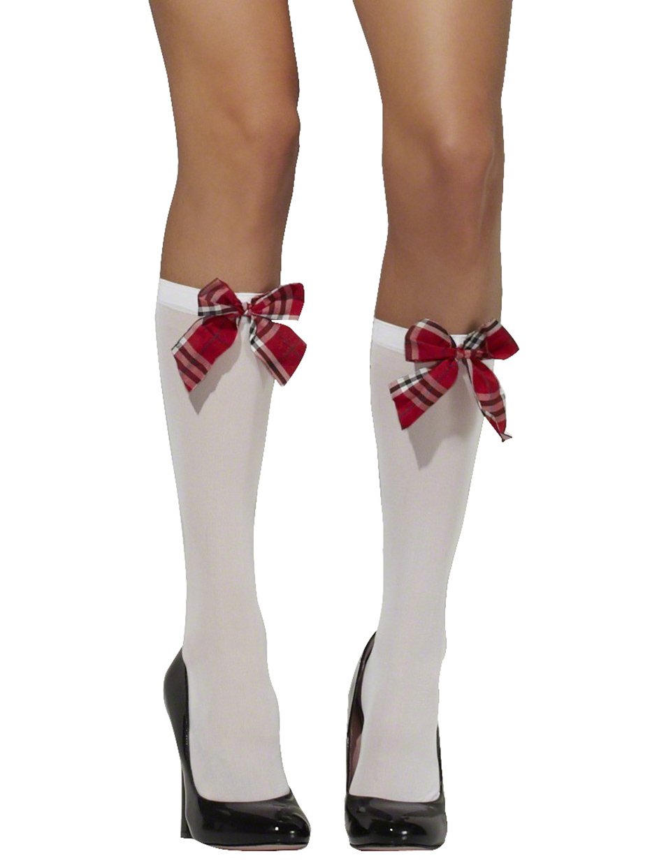 Този чифт бели чорапи за жени има червени, бели и черни плочки отгоре. Те в идеалния случай ще завършат секси облекло на ученичка по време на тематична вечер с приятели или да отпразнуват края на учебната година.