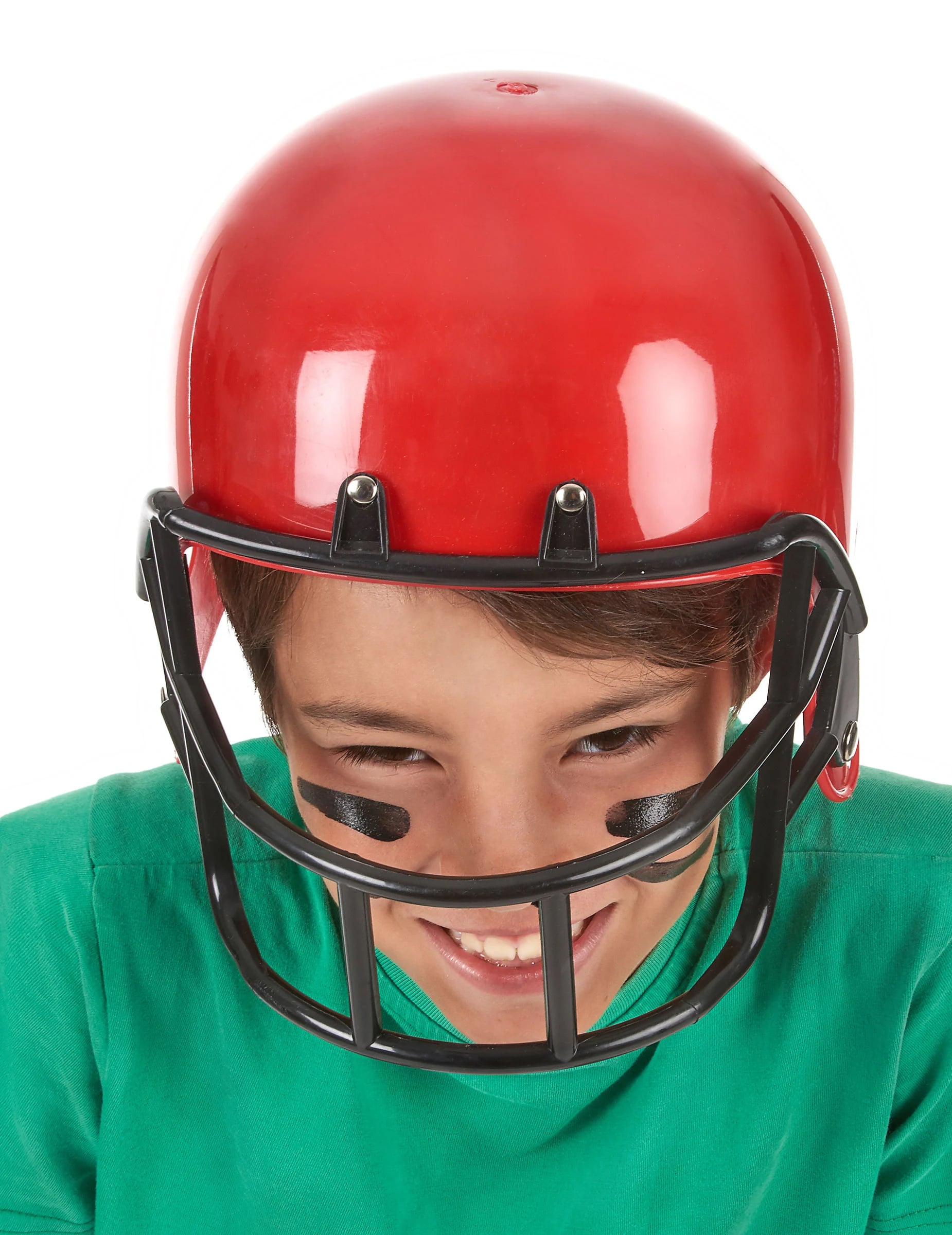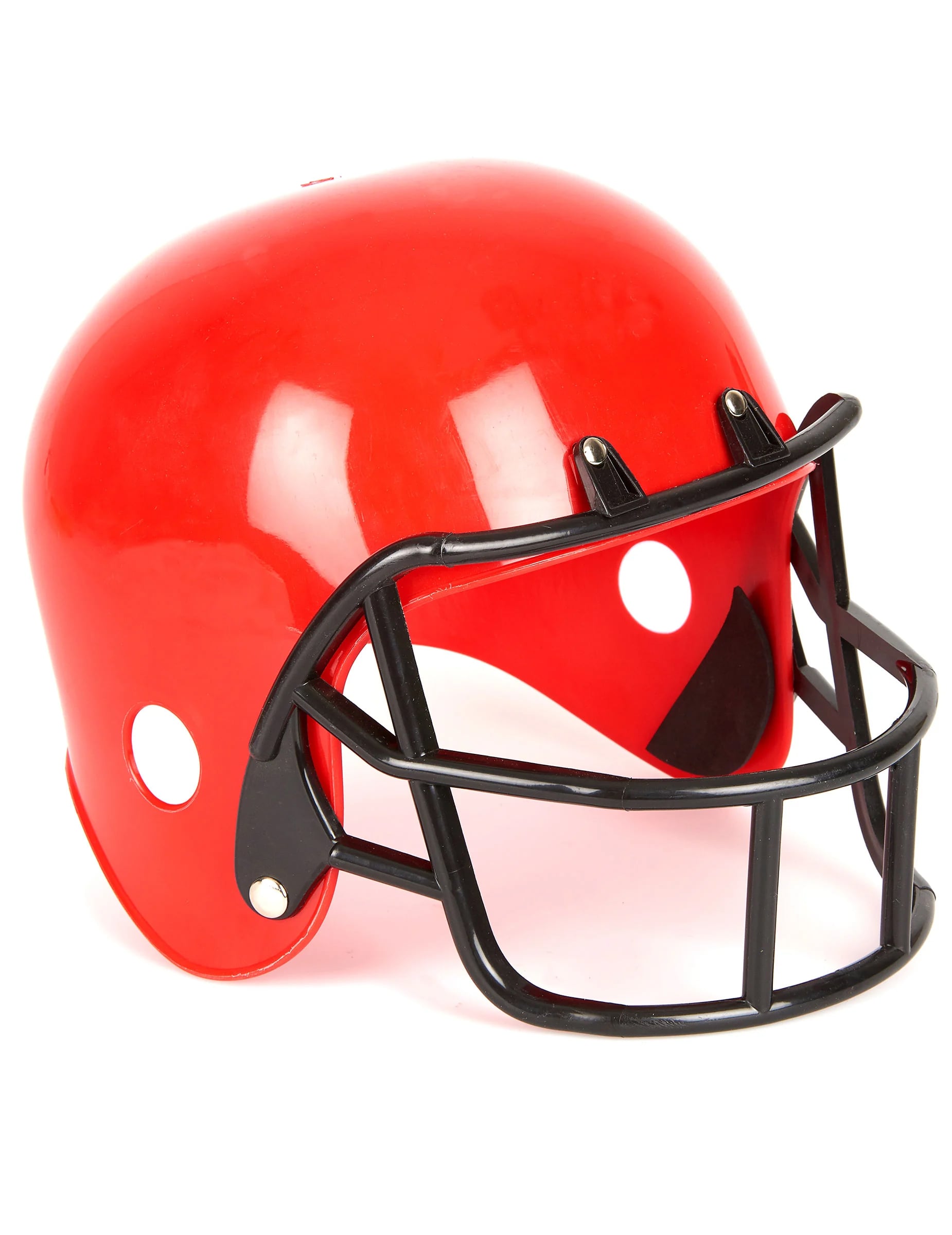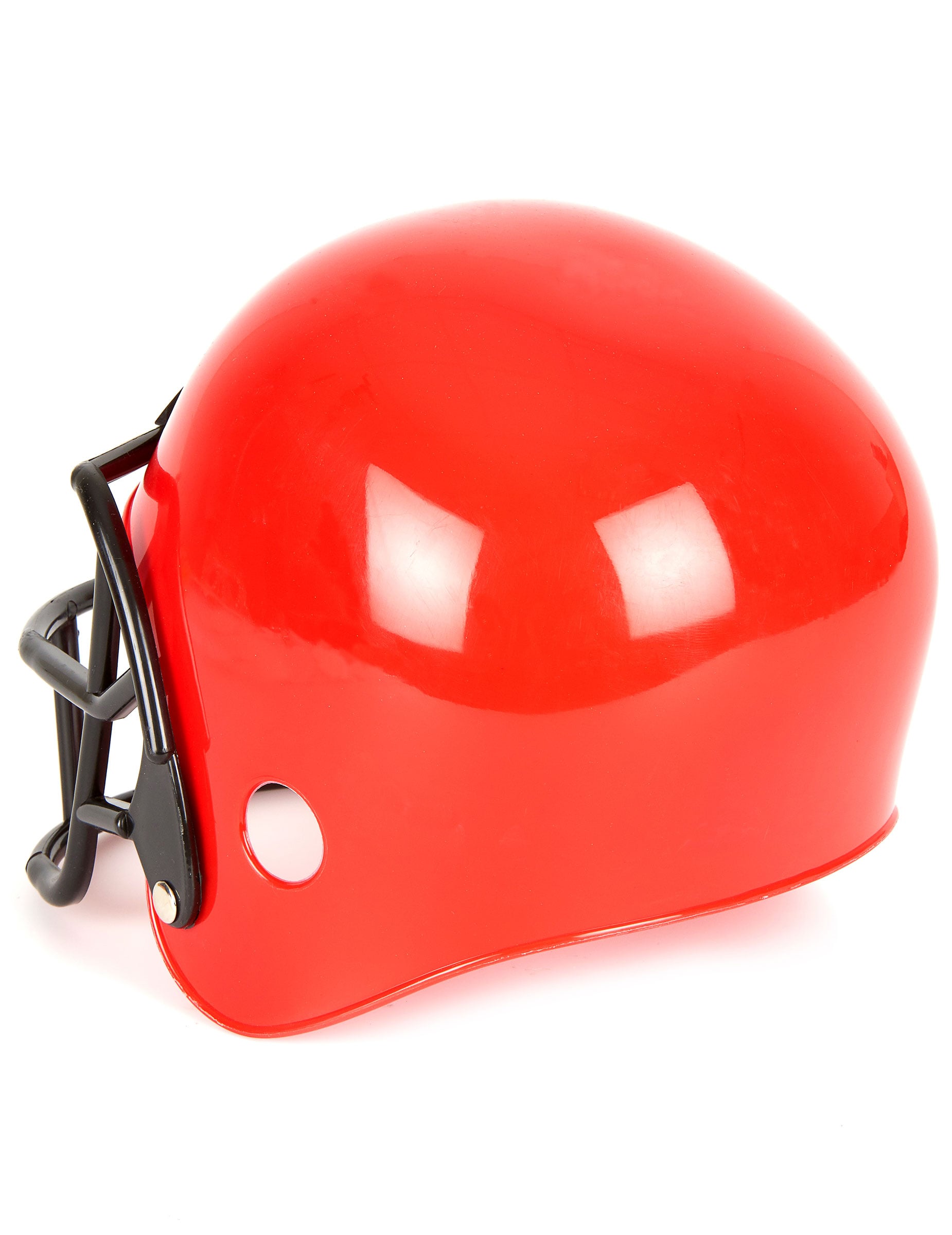 Това Каска за американски футбол Тази детска играчка е изработена от твърда пластмаса. Тя е червена на цвят, с черна пластмасова рамка около лицето.