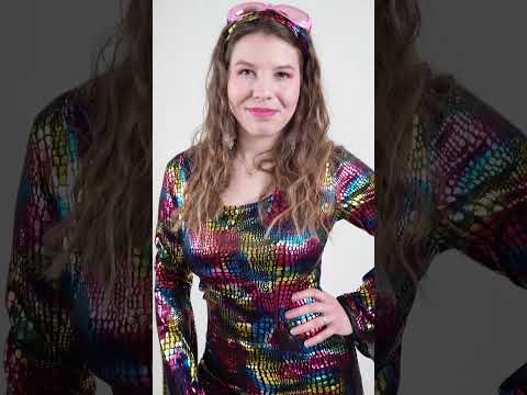 Този диско костюм за жени се състои от рокля и лента за глава (обувките не са включени). Кратката рокля има дълги разпалени ръкави. Черен цвят, той е отпечатан с многоцветни метални модели на стил на влечуги. Съществува и съвпадаща лента за глава. Лесно ще бъде вързан около главата ви. Този костюм ще бъде идеален за блестящи в хиляда светлини по време на ретро вечер по темата на дискотеката.